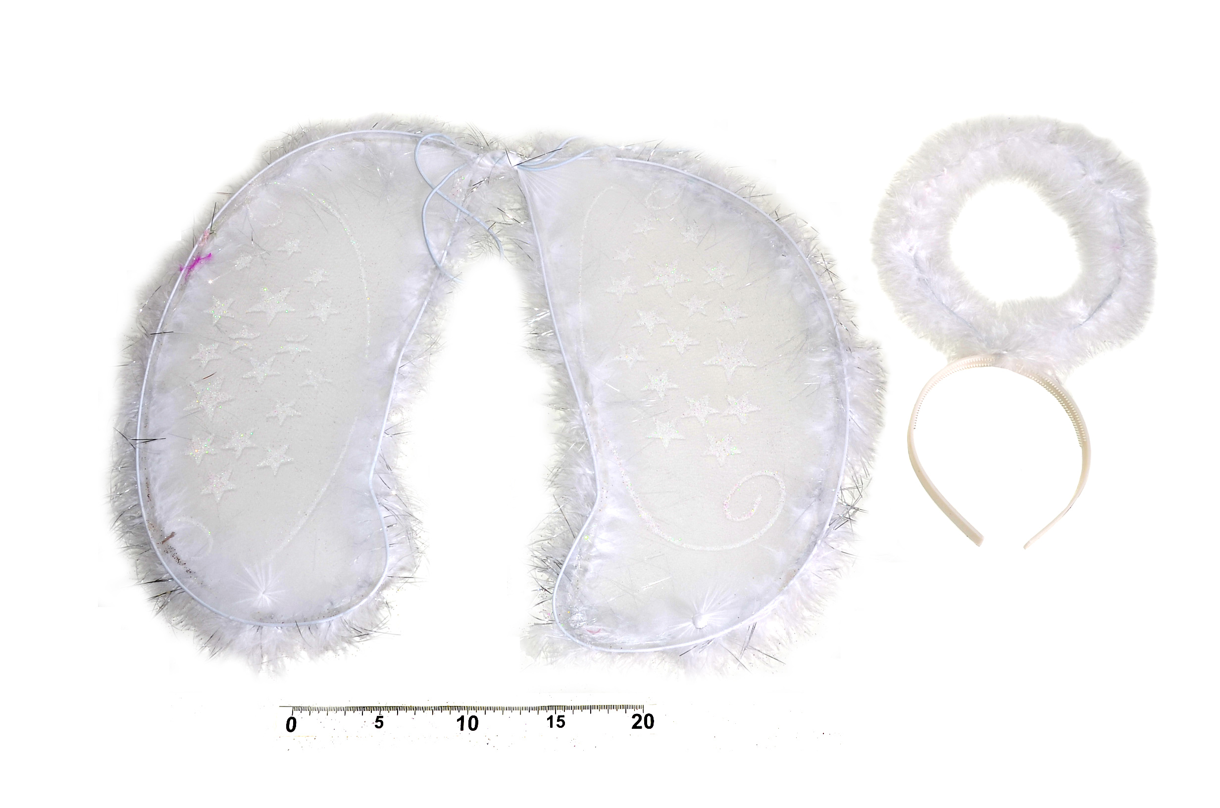 Krásne anjelské krídla pre malé anjelíky. Krídla s perím pre dokonalý anjelský outfit. Sada obsahuje svätozář prichytenú na bielej čelenke a krídla na gumičku. Rozmery rozložených krídiel: 44 cm (šírka) x 38 cm.