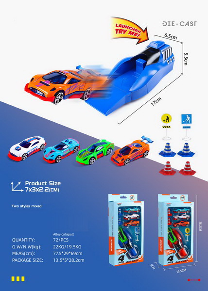 Auta kovová vystřelovací set. Rozměry auta 7x3x2,2 cm. Součástí 4 kovová auta, vystřelovací zařízení, značka, kužely. 2 varianty vystřelovacího zařízení - modrá, červená.
