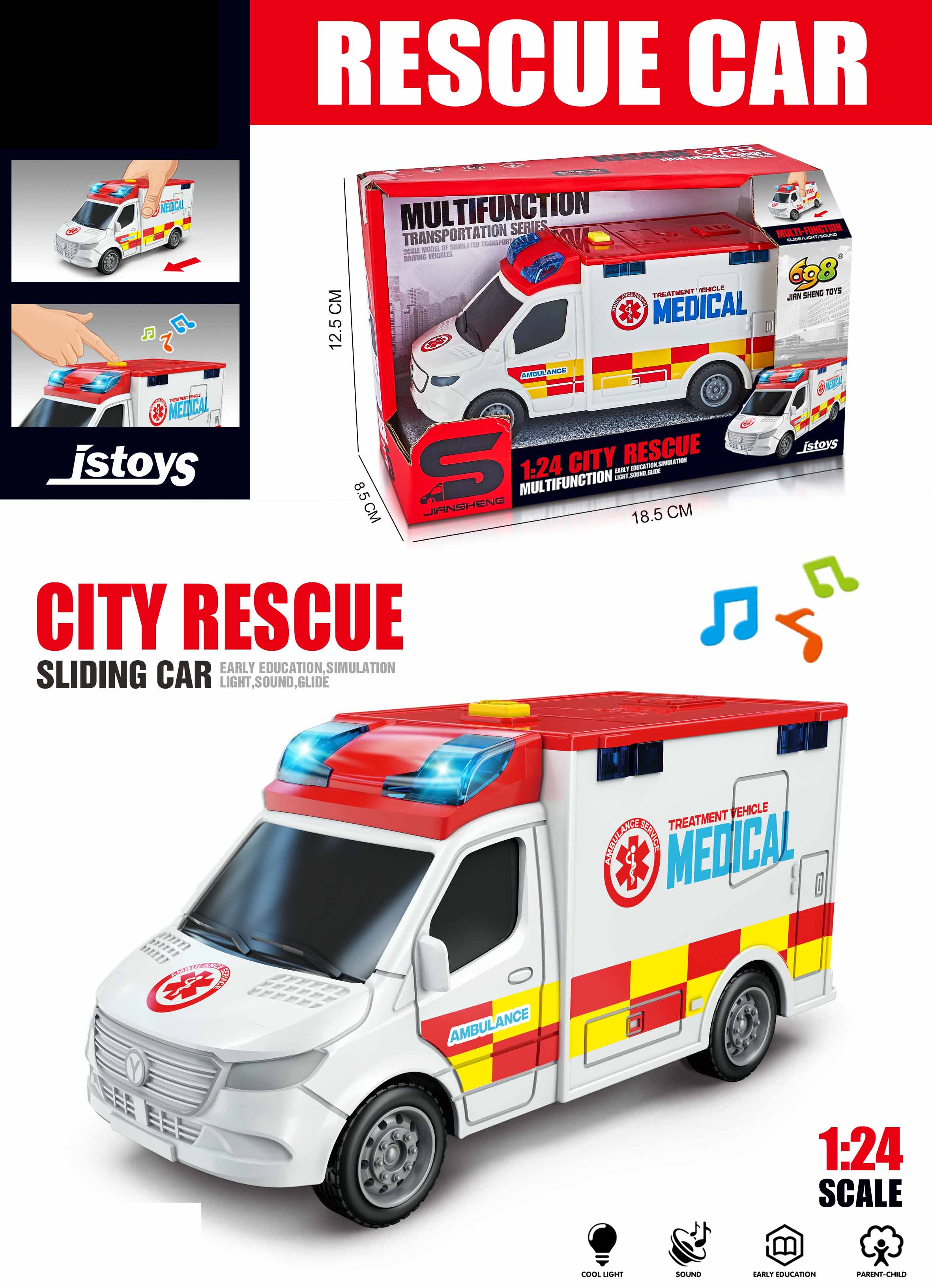 Auto sanitka s efekty. Volná kola. Světelné a zvukové efekty tlačítkem na střeše. 3xAG13 baterie součástí.