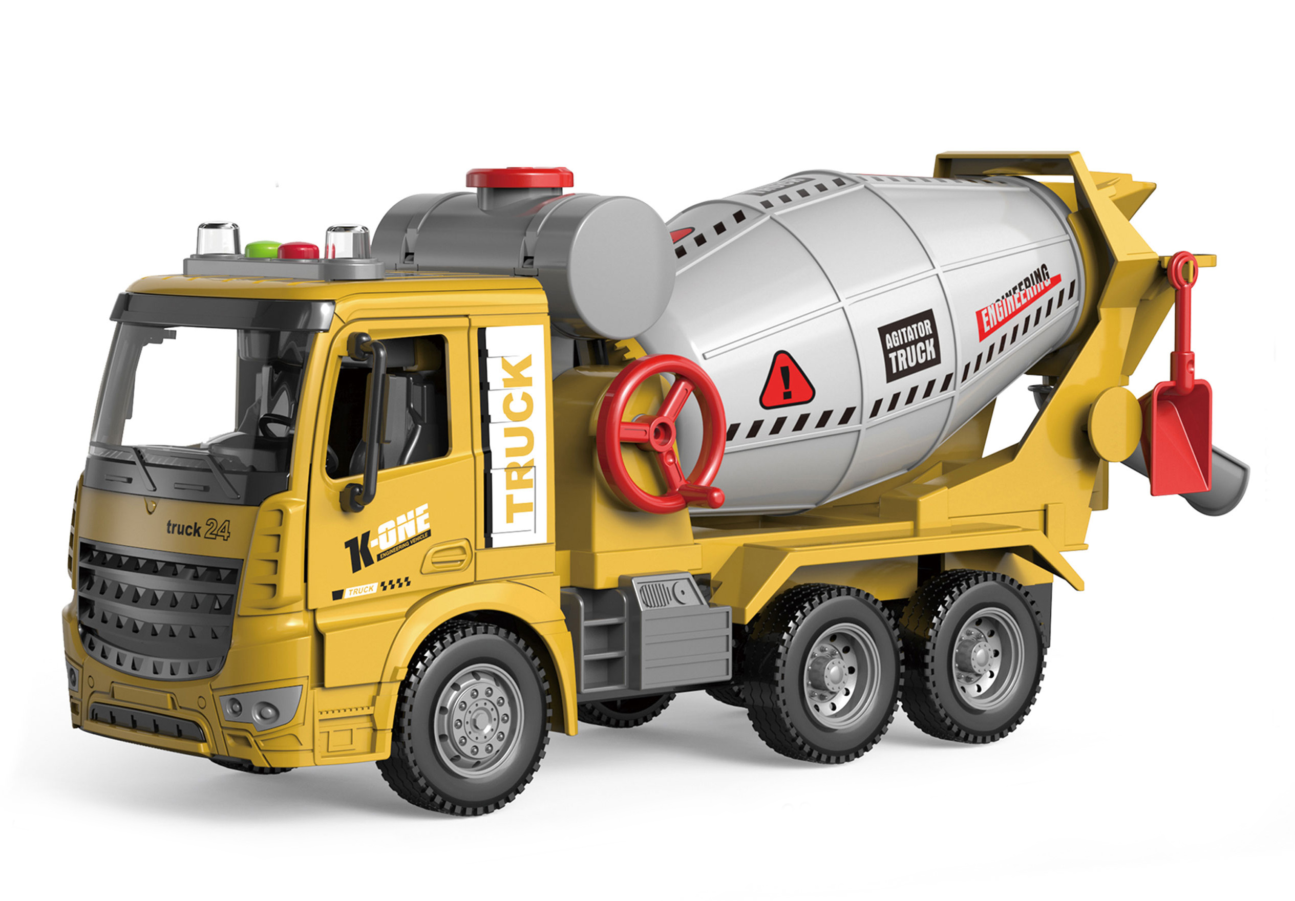 Auto stavební domiešavač na setrvačník s efektmi. Veľkosť 31 cm. Vydáva svetelné a zvukové efekty. Aktivácia tlačidlami na streche (1 tlačidlo - zvuk motora, zvuk miešania, 2 tlačidlo - zvuk cúvania, zvuk trúbenia). Batérie 3xAG13, súčasťou (1,5V).