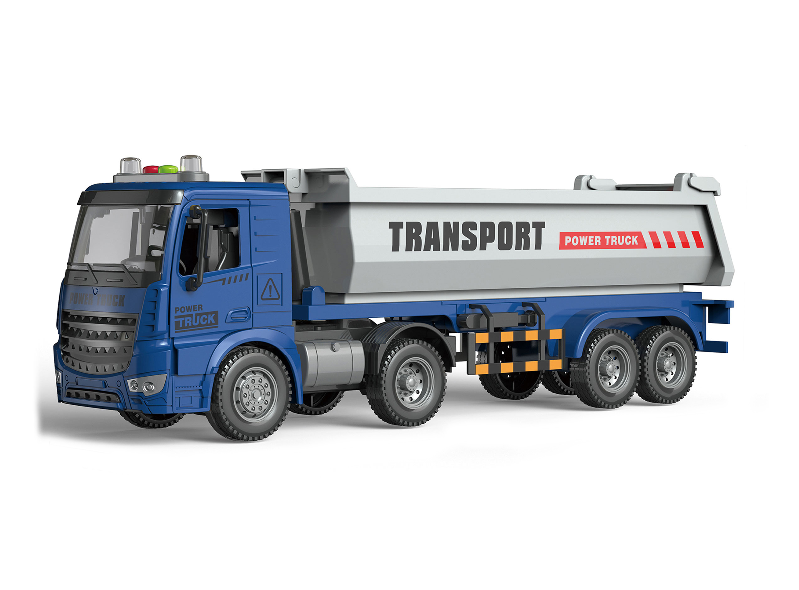 Auto tahač sklápěč na setrvačník s efekty. Velikost 38 cm. Vydává světelné a zvukové efekty. Aktivace tlačítky na střeše. Tlačítko 1 - zvuk motoru, zvuk sklápění. Tlačítko 2 - zvuk couvání, zvuk troubení. Baterie 3xAG13, součástí (1,5V). Otevíratelné dveře, sklápěcí korba, na setrvačník. Návěs je možné odpojit.
