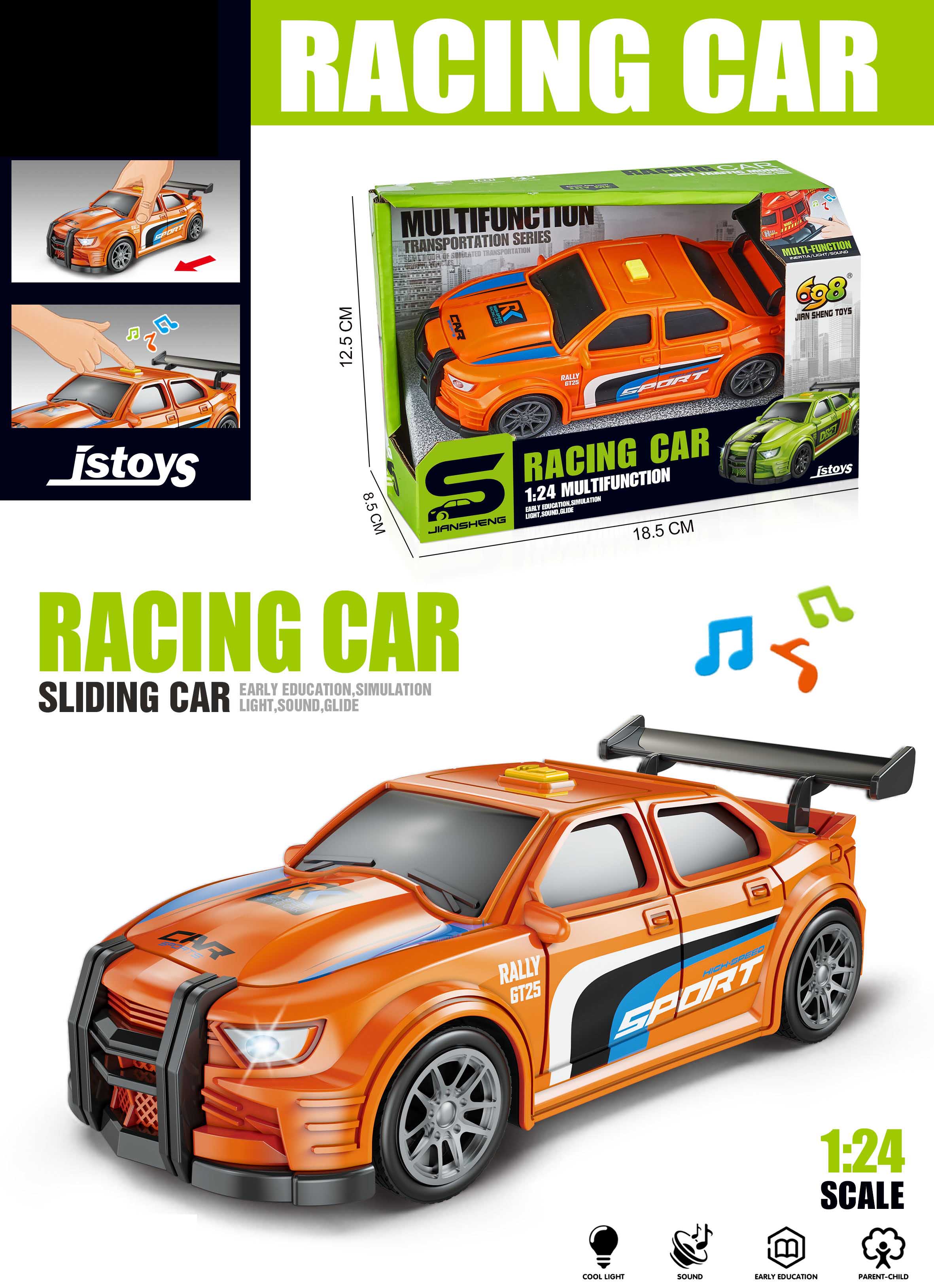 Auto závodní oranžové s efekty. Velikost 16 cm. Volná kola. Světelné a zvukové efekty, aktivace tlačítkem na střeše. 3xAG13 baterie součástí.