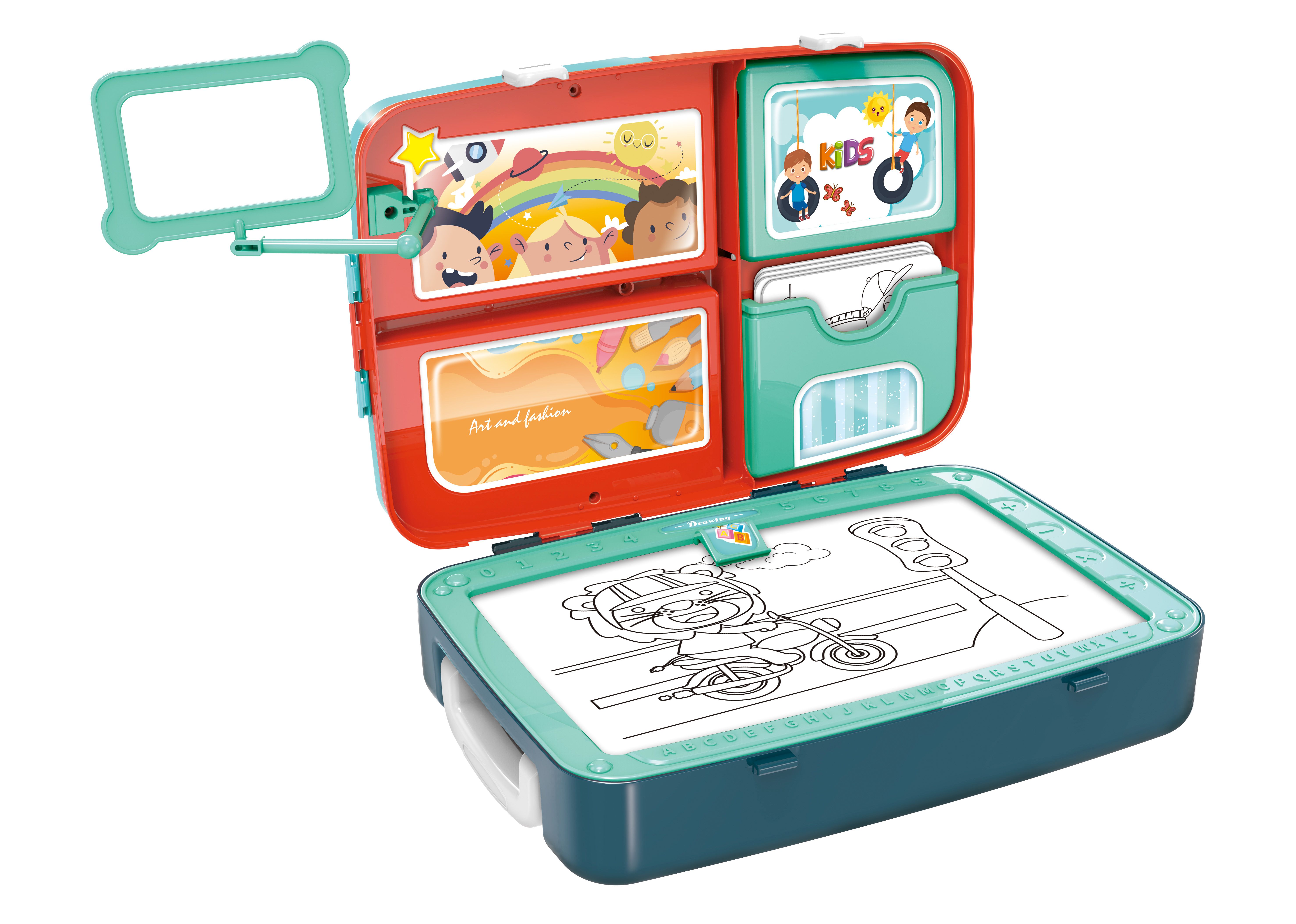 Kreatívny batoh. Veľkosť 28cm. Otvárací batoh, obsahuje otvárateľné priehradky, kresliacu tabuľu na mazacie fixky a prichytenie magnetiek, druhá strana tabuľky sa dá popísať kriedou, magnetické čísla a písmenká, kriedy, hubku na mazanie, mazacie fixky, popruhy na chrbát, nálepky na ozdobenie batohu.