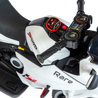 Detská elektrická motorka Rare Baby Mix je vybavená batériou 6V7AH a dvoma motormi s výkonom 380. Disponuje funkciou jednoduchého štartu na jedno tlačidlo, ktorá umožňuje jazdu vpred aj vzad. Motorka je vybavená hudbou, pesničkami pre deti, kartou na čítanie dát pre ranné vzdelávanie, troma kolesami a LED svetlometmi. Komfort zabezpečuje kožené sedadlo.