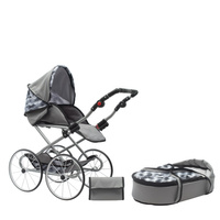 VYSTAVENÝ KUS, MIERNE ODIERKY NA KONŠTRUKCII. Krásny a jedinečný detský Retro kočík 2v1 New Baby Nella pre malé slečny. Kočík je veľmi kvalitný s kovovou konštrukciou. Hlboký kočík možno upraviť aj na športový. Vanička je upevnená v smere jazdy a možno ju použiť na prenášanie bábiky. Vanička má zapínanie na zips. Kočík má nastaviteľnú rukoväť. Súčasťou je aj taška na drobnosti vo farbe kočíka a veľký nákupný košík. Moderný a ľahký kočík pre bábiky s klasickou odpruženou konštrukciou v pestrých farbách. Kočík má poistku proti samovoľnému zloženiu. Vyrobené v EU.