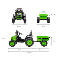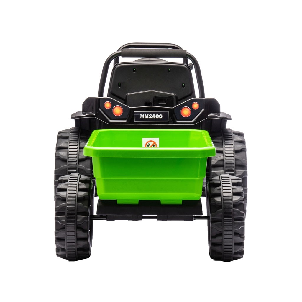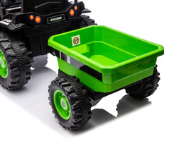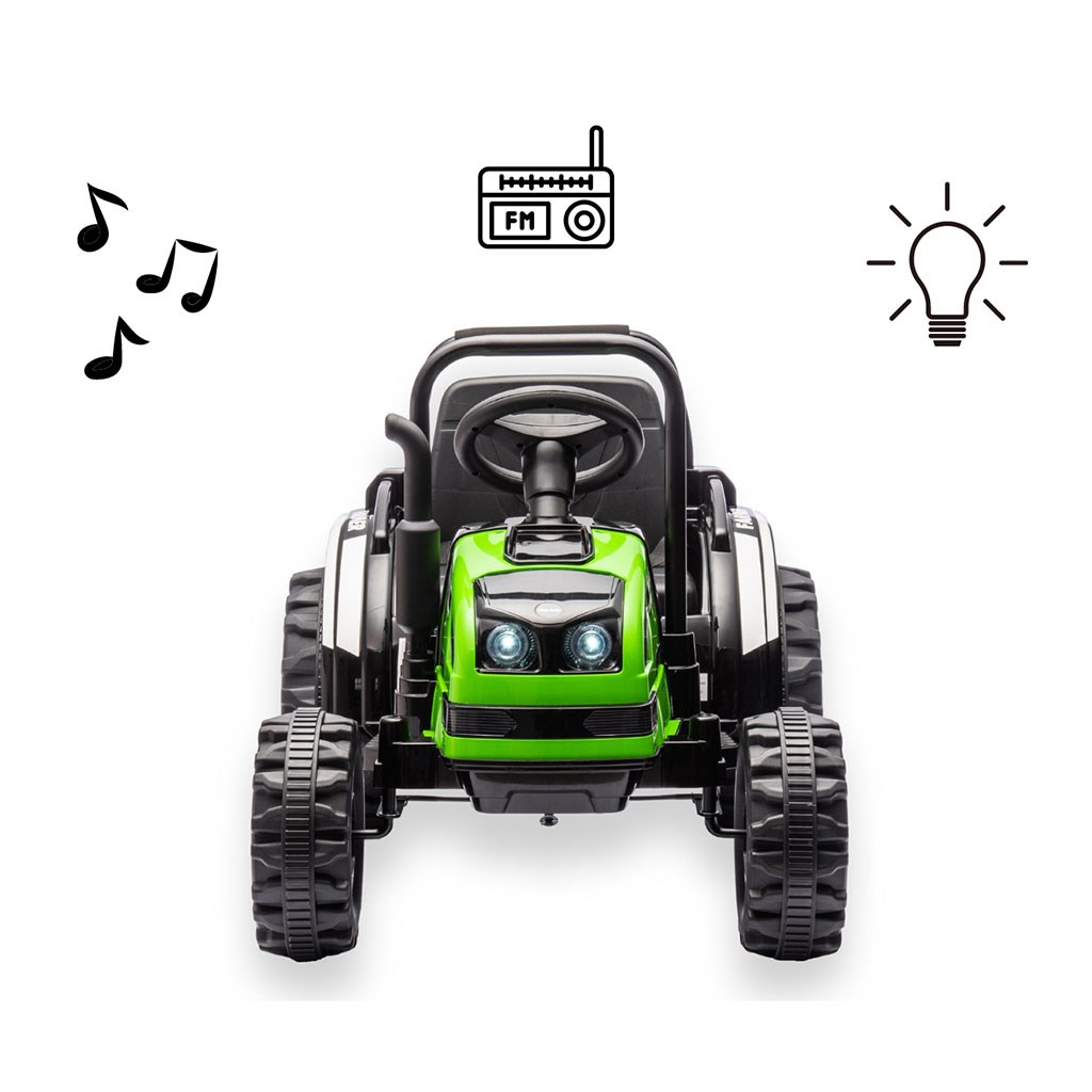 Je to ideálne vozidlo pre deti vo veku od 3 do 5 rokov. Traktor sa dodáva s prívesom pre väčšiu zábavu. Kovové bezpečnostné tyče vpredu a vzadu a imitácia komína/výfuku, vrčiaci zvuk motora traktora, to všetko umožňuje malým vodičom popustiť uzdu svojej fantázii a cítiť sa ako skutoční traktoristi. Vypínač aktivuje realistický vrčivý zvuk motora traktora, zatiaľ čo tlačidlo súčasne vypína vozidlo. Dva motory umiestnené v traktore dosahujú priemernú rýchlosť 3 - 5 km/h.