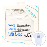 Originálne bavlnené dojčenské body s dlhým rukávom New Baby, s vtipným nápisom 50% MAMIČKA + 50% OTECKO - 100% JA. Farby použité k potlači sú certifikované a vhodné pre bábätká. Je vyrobené z príjemného a kvalitného materiálu, v ktorom sa bude Vaše bábätko cítiť príjemne. Body má zapínanie na cvočky na ramienku a medzi nožičkami, čo uľahčuje obliekanie a prebaľovanie. Doprajte Vášmu bábätku vyniknúť v originálnom body. Zloženie: 100% bavlna. Rozmery: obvod okolo hrudníka cca 36 cm, dĺžka rukáva cca 18 cm, celková dĺžka cca 32 cm.