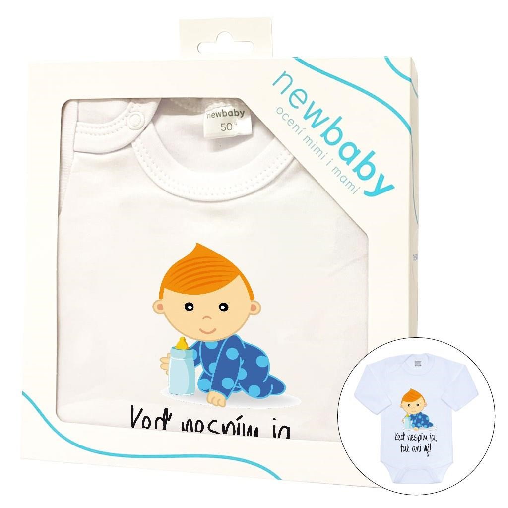 Originálne bavlnené dojčenské body s dlhým rukávom New Baby, s vtipným nápisom Keď nespím ja, tak ani vy! A obrázkom roztomilého chlapčeka. Farby použité k potlači sú certifikované a vhodné pre bábätká. Je vyrobené z príjemného a kvalitného materiálu, v ktorom sa bude Vaše bábätko cítiť príjemne. Body má zapínanie na cvočky na ramienku a medzi nožičkami, čo uľahčuje obliekanie a prebaľovanie. Doprajte Vášmu bábätku vyniknúť v originálnom body. Zloženie: 100% bavlna. Rozmery: obvod okolo hrudníka cca 34 cm, dĺžka rukáva cca 16 cm, celková dĺžka cca 30 cm.
