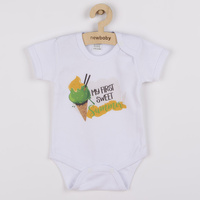 Originálne bavlnené dojčenské body s krátkym rukávom New Baby s nápisom MY FIRST SWEET Summer a obrázkom chutnej zmrzlinky. Farby použité k potlači sú certifikované a vhodné pre bábätká. Je vyrobené z príjemného a kvalitného materiálu, v ktorom sa bude Vaše bábätko cítiť príjemne. Body má zapínanie na cvočky na ramienku a medzi nožičkami, čo uľahčuje obliekanie a prebaľovanie. Doprajte Vášmu bábätku vyniknúť v originálnom body. Zloženie: 100% bavlna.