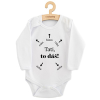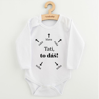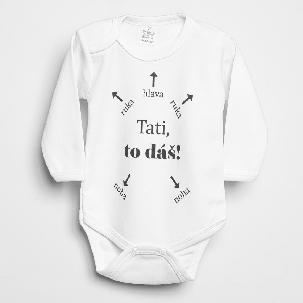Originálne bavlnené dojčenské body s dlhým rukávom New Baby, s vtipným nápisom Tati, to dáš! Farby použité k potlači sú certifikované a vhodné pre bábätká. Je vyrobené z príjemného a kvalitného materiálu, v ktorom sa bude Vaše bábätko cítiť príjemne. Body má zapínanie na cvočky na ramienku a medzi nožičkami, čo uľahčuje obliekanie a prebaľovanie. Doprajte Vášmu bábätku vyniknúť v originálnom body. Zloženie: 100% bavlna. Rozmery: obvod okolo hrudníka cca 34 cm, dĺžka rukáva cca 16 cm, celková dĺžka cca 30 cm.