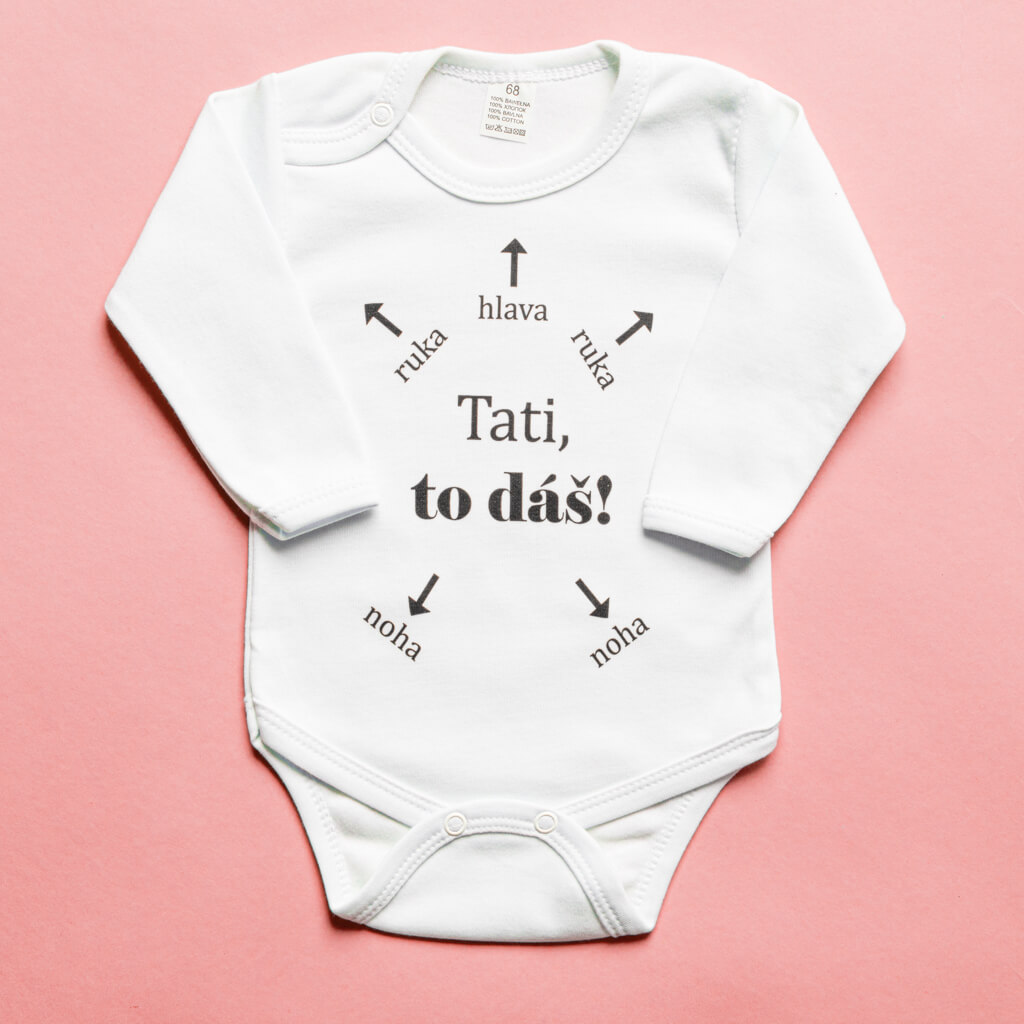 Originálne bavlnené dojčenské body s dlhým rukávom New Baby, s vtipným nápisom Tati, to dáš! Farby použité k potlači sú certifikované a vhodné pre bábätká. Je vyrobené z príjemného a kvalitného materiálu, v ktorom sa bude Vaše bábätko cítiť príjemne. Body má zapínanie na cvočky na ramienku a medzi nožičkami, čo uľahčuje obliekanie a prebaľovanie. Doprajte Vášmu bábätku vyniknúť v originálnom body. Zloženie: 100% bavlna. Rozmery: obvod okolo hrudníka cca 34 cm, dĺžka rukáva cca 16 cm, celková dĺžka cca 30 cm.