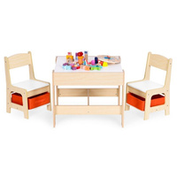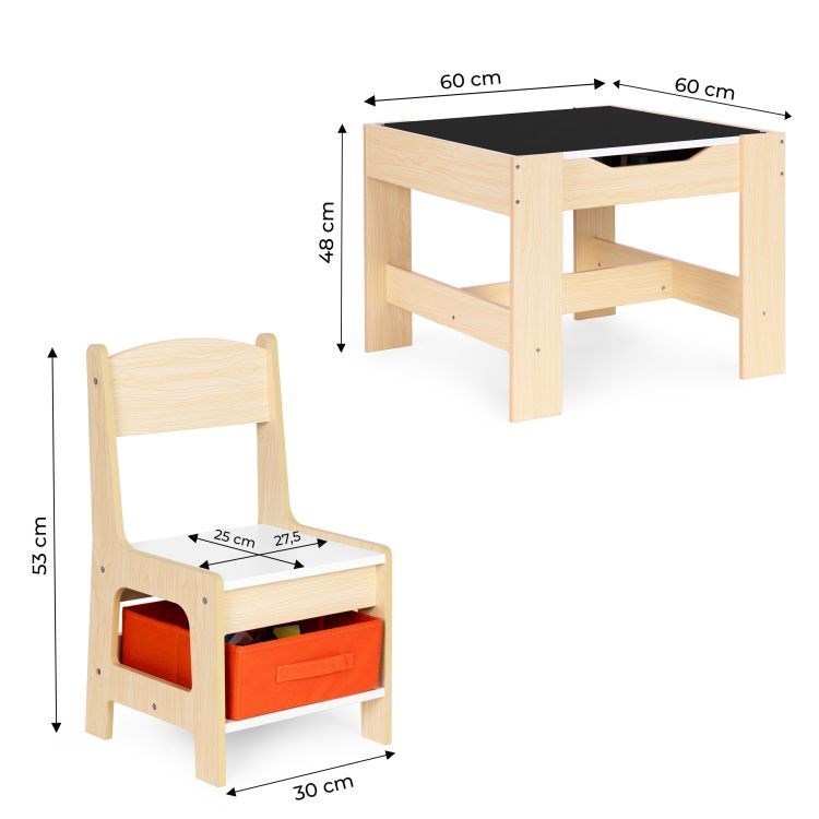 Súprava obsahuje dve stoličky a stôl. Súpravu charakterizuje odolná a stabilná konštrukcia z MDF. Stôl je vybavený obojstrannou odnímateľnou doskou s tabuľou. Pod doskou sa nachádza funkčný priestor na odkladanie kociek, hračiek alebo iných drobností. Pod sedadlami stoličiek sa nachádzajú priestranné textilné zásuvky, ktoré sú ideálne na ukladanie hračiek. Sada je ideálna do detských izieb, herní a čakární.