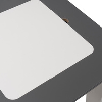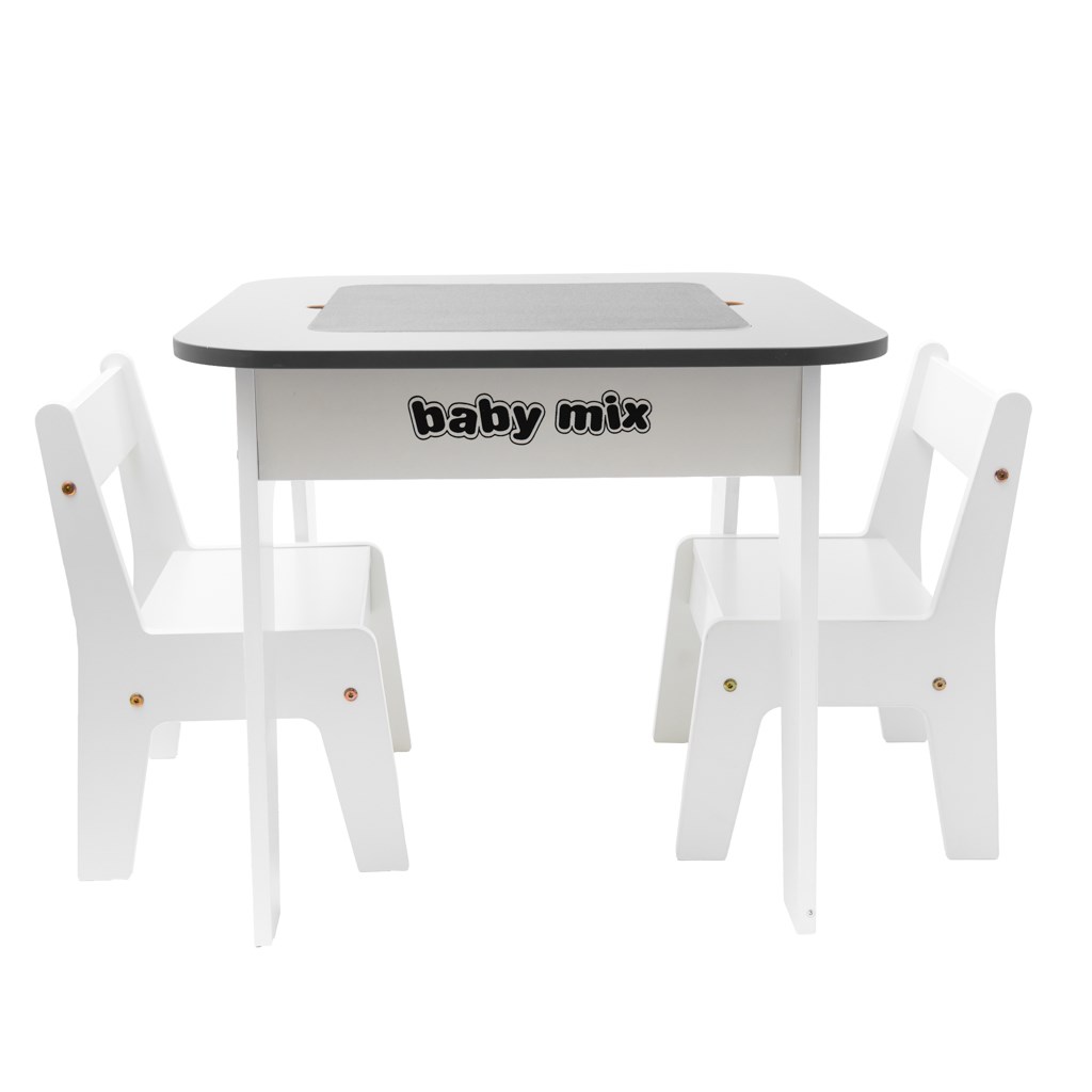 Súčasťou setu je stôl a dve stoličky vyrobené z odolného materiálu, ktorý zabezpečuje stabilitu a dlhú životnosť. Stôl je vybavený praktickou odnímateľnou doskou – pod ňou sa nachádza úložný priestor, kam možno jednoducho uložiť pastelky, papier, drobné hračky alebo stavebnice. Deti tak majú všetko potrebné vždy po ruke a zároveň si udržiavajú poriadok.
