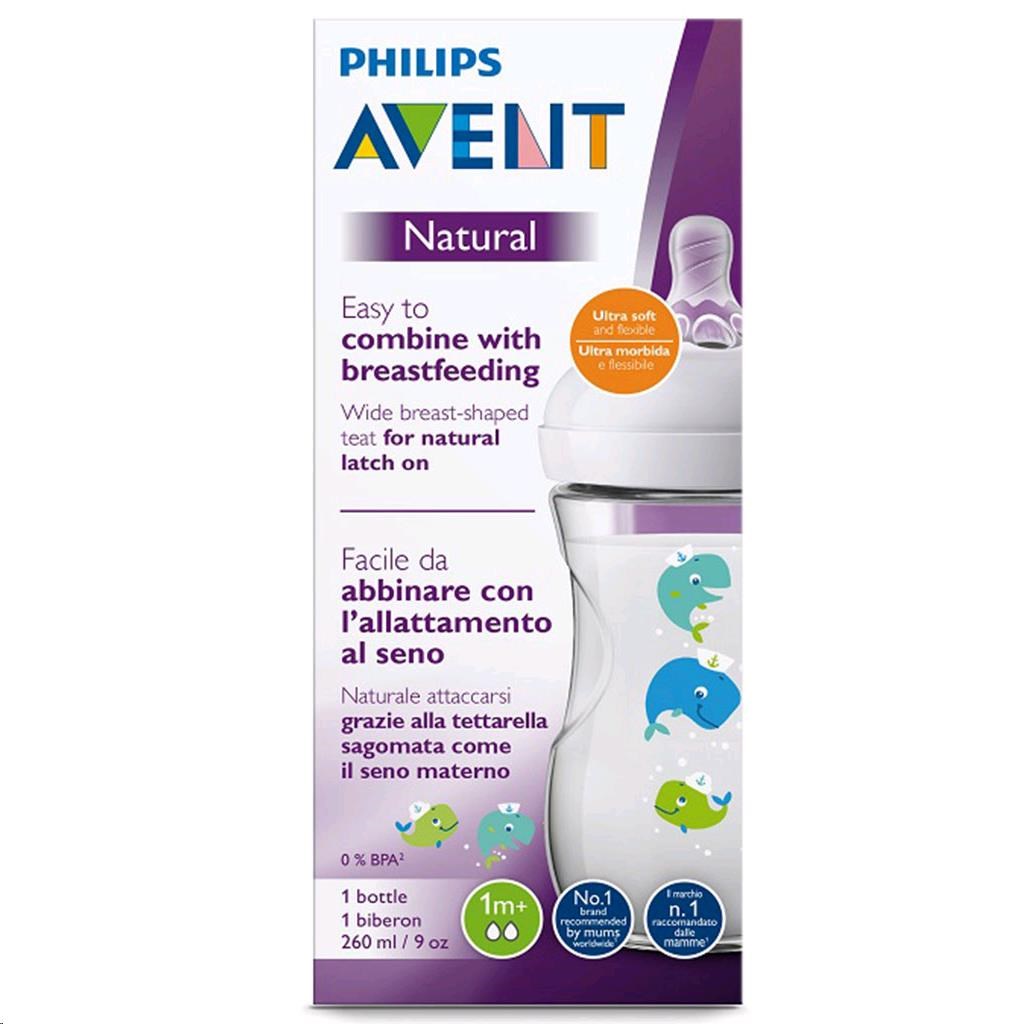 Detská fľaša AVENT Natural veľryba s cumlíkom. Široký cumlík v tvare prsníka uľahčuje dieťaťu kombinovať dojčenie a kŕmenie z fľaše. Tvar okvetných lístkov v cumlíku zvyšuje mäkkosť a pružnosť, bez toho aby došlo k jeho stlačeniu. Cumlík má 2 otvory-pomalý až stredný prietok. Tesne priliehajúce viečko zabraňuje vylievaniu obsahu fľaštičky a nie je teda potrebné použiť tesniace viečka. Inovatívny dvojventilový systém znižuje riziko koliky a nepohodlie tým, že vzduch prúdi do fľaše a nie do bruška dieťaťa. Fľaša neobsahuje BPA (Bisfenol A). Ergonomický tvar fľaše umožňuje jednoduché držanie aj pre malé detské rúčky. Balenie obsahuje cumlík a priehľadné viečko. Určené pre deti od 1m +. Obsah 260 ml. - ergonomický, profilovaný tvar fľaše, ktorý uľahčuje držanie