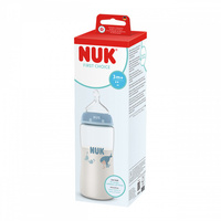 Dojčenská fľaša NUK First Choice s kontrolou teploty. Špeciálny tvar typický pre cumlík NUK s ortodontickým antikolikový cumlíkom je modelovaný podľa materskej bradavky pri dojčení. Dojčenské fľaše sú teraz vybavené novou NUK kontrolkou teploty a pomáhajú tak zabrániť tomu, aby vaše dieťa pilo príliš horúci príkrm. Kontrolka vyzerá ako teplomer, je umiestnená medzi ryskami a teplota obsahu fľaše zmení jej farbu. Ak je príkrm príliš horúci, modrá kontrolka sa zmení na bielu. Vyrobená z vysoko kvalitného nerozbitného plastu polypropylénu a neobsahuje BPA (Bisfenol A). Obsah fľaše 300 ml. Vhodná pre deti od 3 mesiacov M (stredne veľký otvor = pre detskú výživu). Klinicky testované.