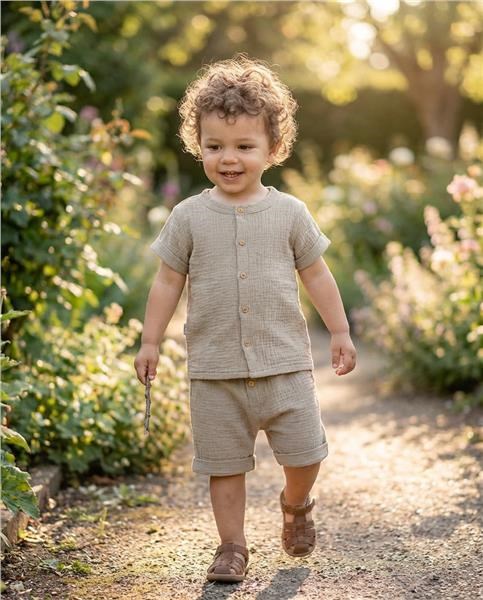 Štýlová 2-dielna mušelínová súpravička New Baby pre bábätká. Súpravička obsahuje košeľu a kraťasy. Košeľa s krátkym rukávom má zapínanie na gombíky. Šmrncovné kraťasky majú v páse širšiu gumičku a falošné zapínanie na gombíky. Krásny, vzdušný komplet na letné dni pre chlapčekov. Súpravička je ľahučká a veľmi príjemná pri noseníí. Mušelín je jedna z najčistejších, najjednoduchších a najjemnejších tkanín na svete. Jemne tkaný priedušný materiál je taký dokonalý, že si ho zamilujú deti po celom svete. Ľahká štruktúra umožňuje mušelínu „dýchať“ a zaisťuje dostatočnú cirkuláciu vzduchu, čím znižuje riziko prehriatia. Táto vlastnosť pomáha udržať Vaše dieťa v pohodlí, bezpečí a rodičia v pokoji. Mušelín je veľmi odolný a to tak, že bez problémov zvláda opakované pranie a postupom času je ľahší a jemnejší. Zloženie: 100% bavlna. OEKO-TEX STANDARD 100.