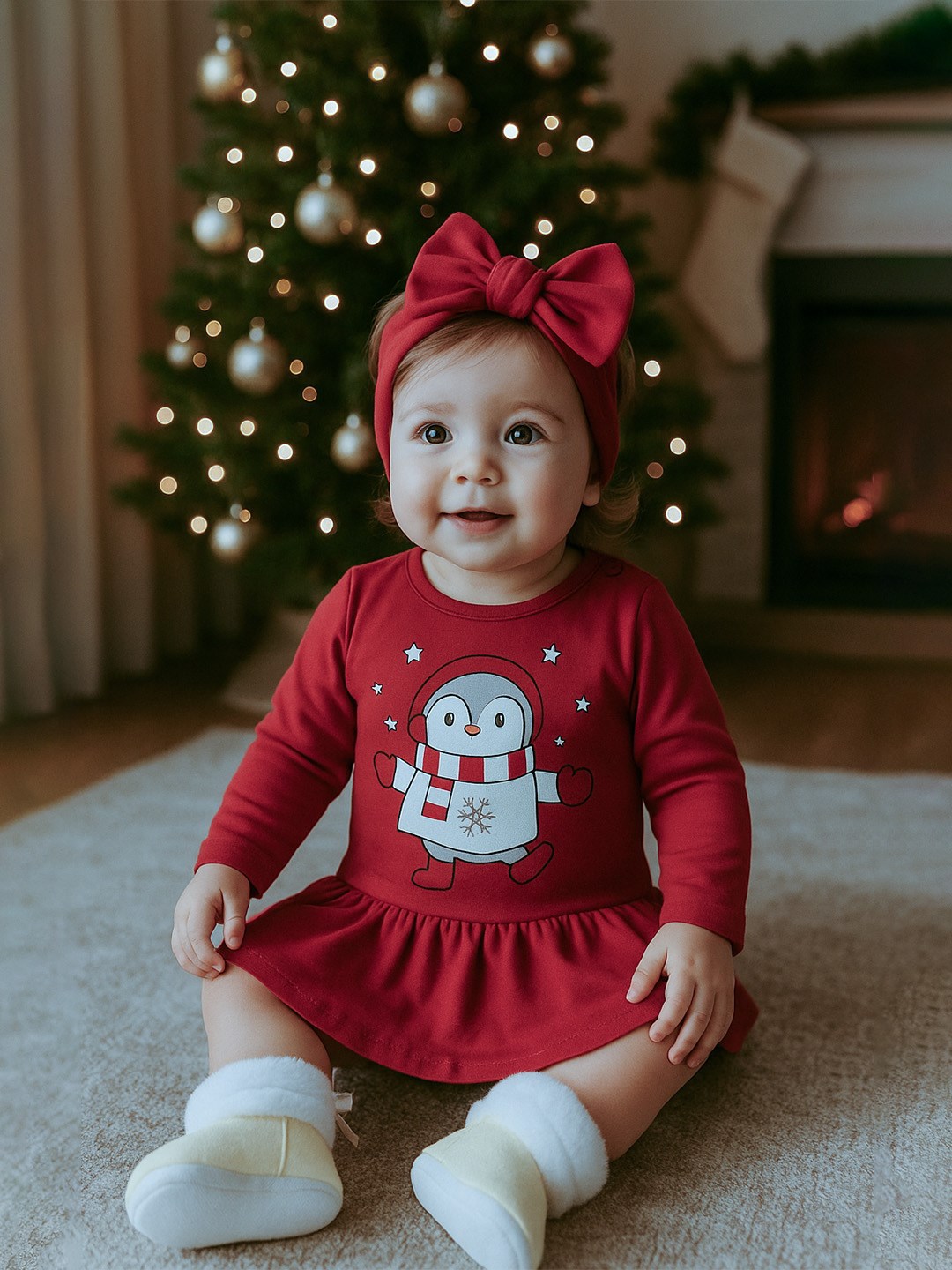 Krásne bavlnené dojčenské šatôčky s čelenkou New Baby Winter Penguin pre všetky malé parádnice. Šatičky s dlhým rukávom v krásnej červenej farbe sú zdobené roztomilým a veselým