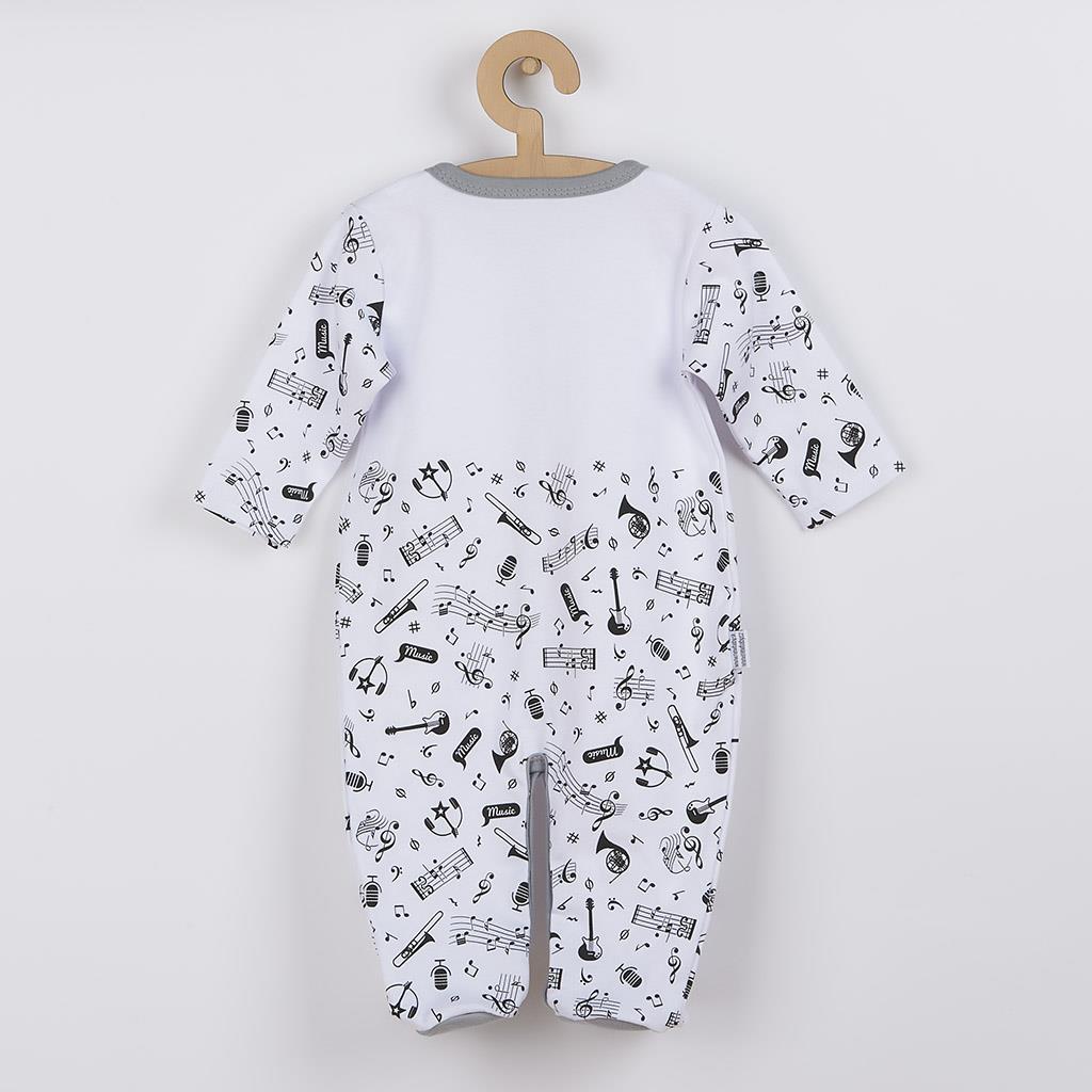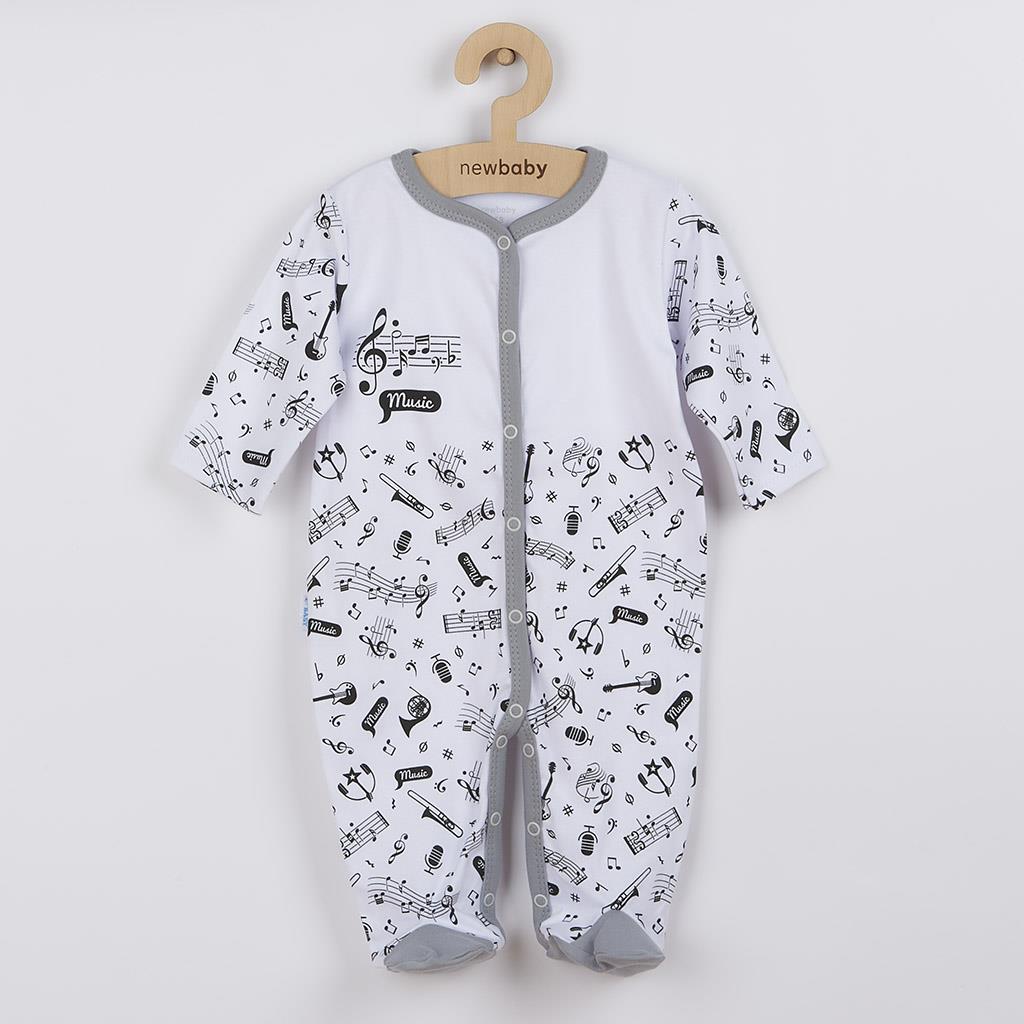 Originálny, hravý a zároveň veselý bavlnený dojčenský overal New Baby Music pre bábätká. Detský overal má rukávky a spodnú časť celopotlačenú notičkami a hudobnými nástrojmi. Vrchná časť je zdobená roztomilým obrázkom notiček a nápisom Music. Zapínanie na cvočky po celej dĺžke a medzi nožičkami uľahčí obliekanie a prebaľovanie. Vďaka nápaditému dizajnu bude dieťatko v overáliku veľmi originálne. Kladieme dôraz na kvalitu a preto sa vďaka príjemnému, mäkkému a kvalitnému materiálu, bude Vaše bábätko cítiť veľmi príjemne. Náš overal je vhodný pre chlapcov aj dievčatká. Zloženie: 100% bavlna. Rozmery: obvod okolo hrudníka cca 46 cm, celková dĺžka cca 45 cm, dĺžka od rozkroku cca 15 cm, dĺžka rukávov cca 17 cm.