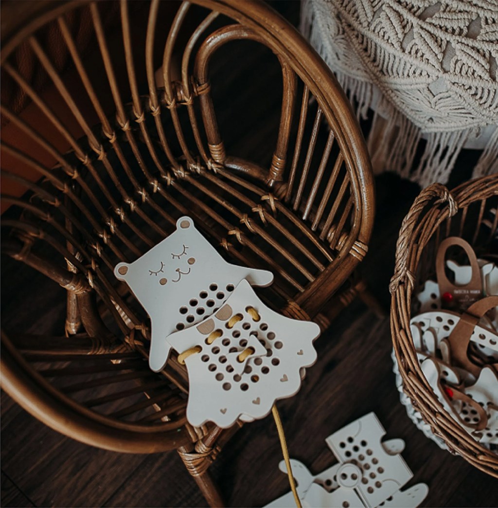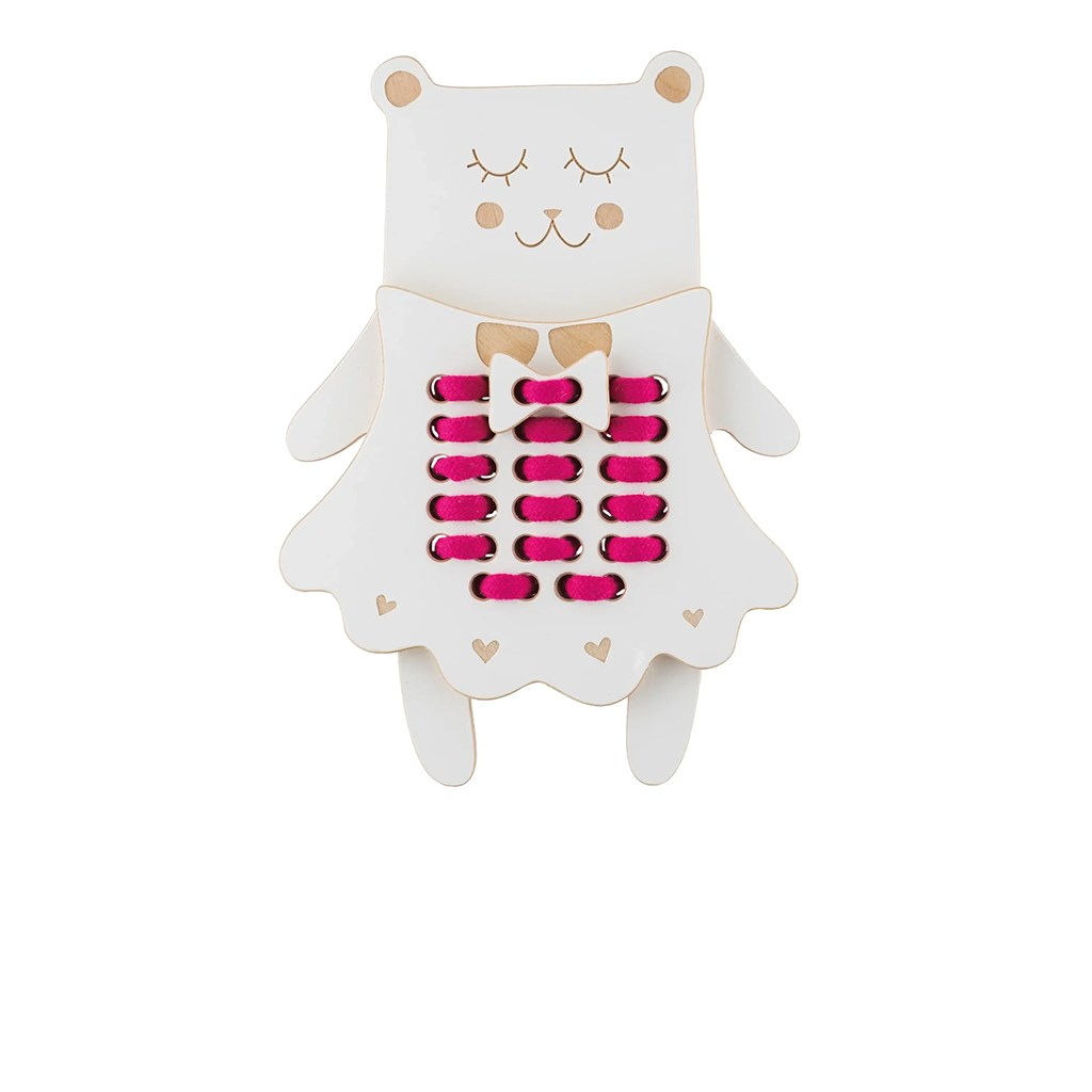 Drevená Montessori prevliekacia hračka Slečna Medvedica – pokročilá úroveň