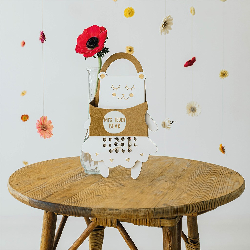 Vzor pre malých majstrov prevliekania. Sada obsahuje 3 prvky – medvedicu, šaty a mašľu, ktoré sú spojené šnúrkou.