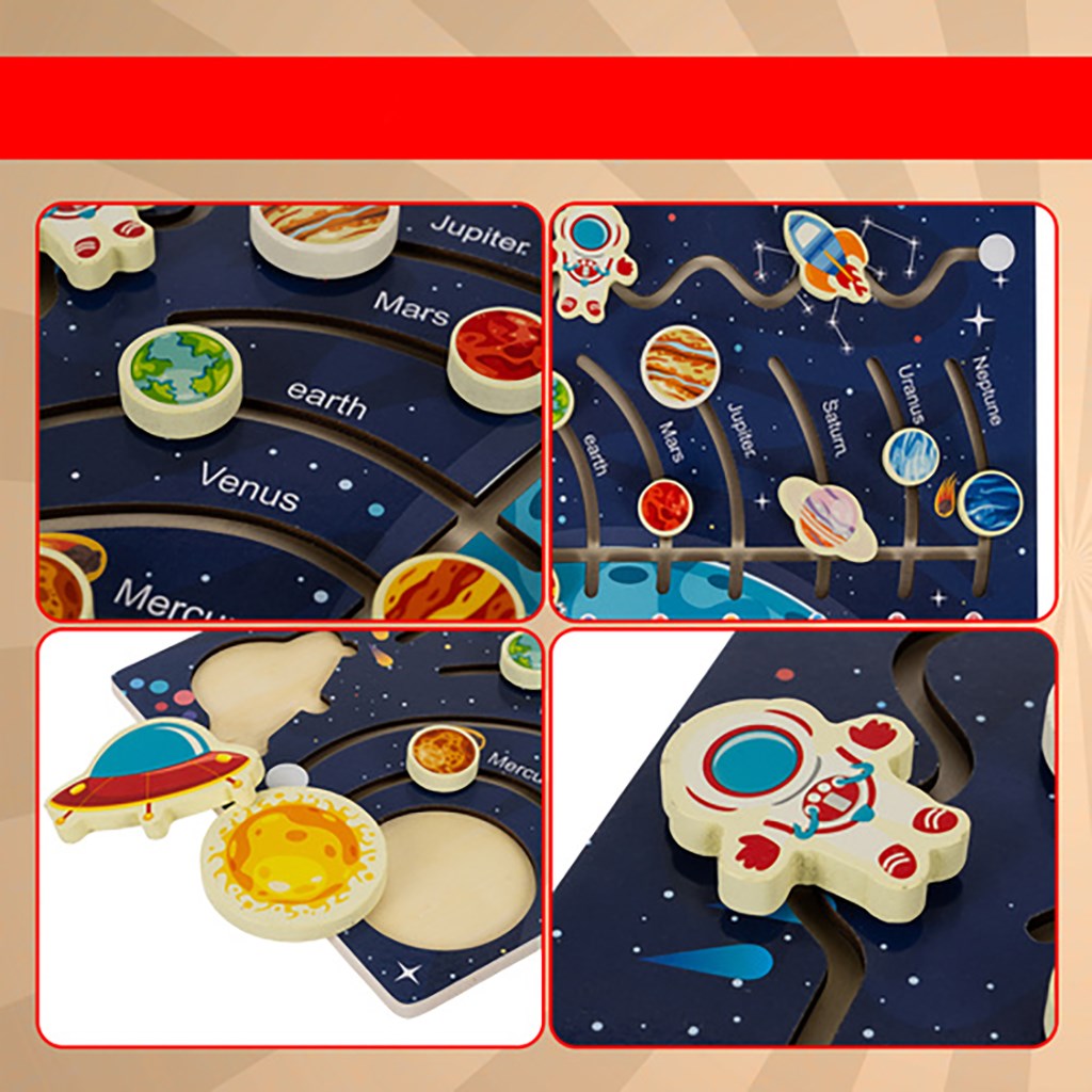 Drevená Montessori skladačka – Slnečná sústava: labyrint s planétami a raketou – motorická a logická hračka pre deti