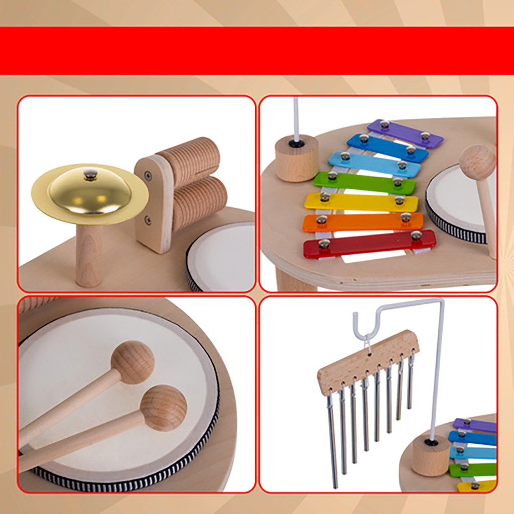 Drevený Vzdelávací Stolík „Perkusia” – senzorický Montessori s cimbalmi, bubienkami a chrastítkami pre deti – hudobný a senzorický rozvoj pre batoľatá