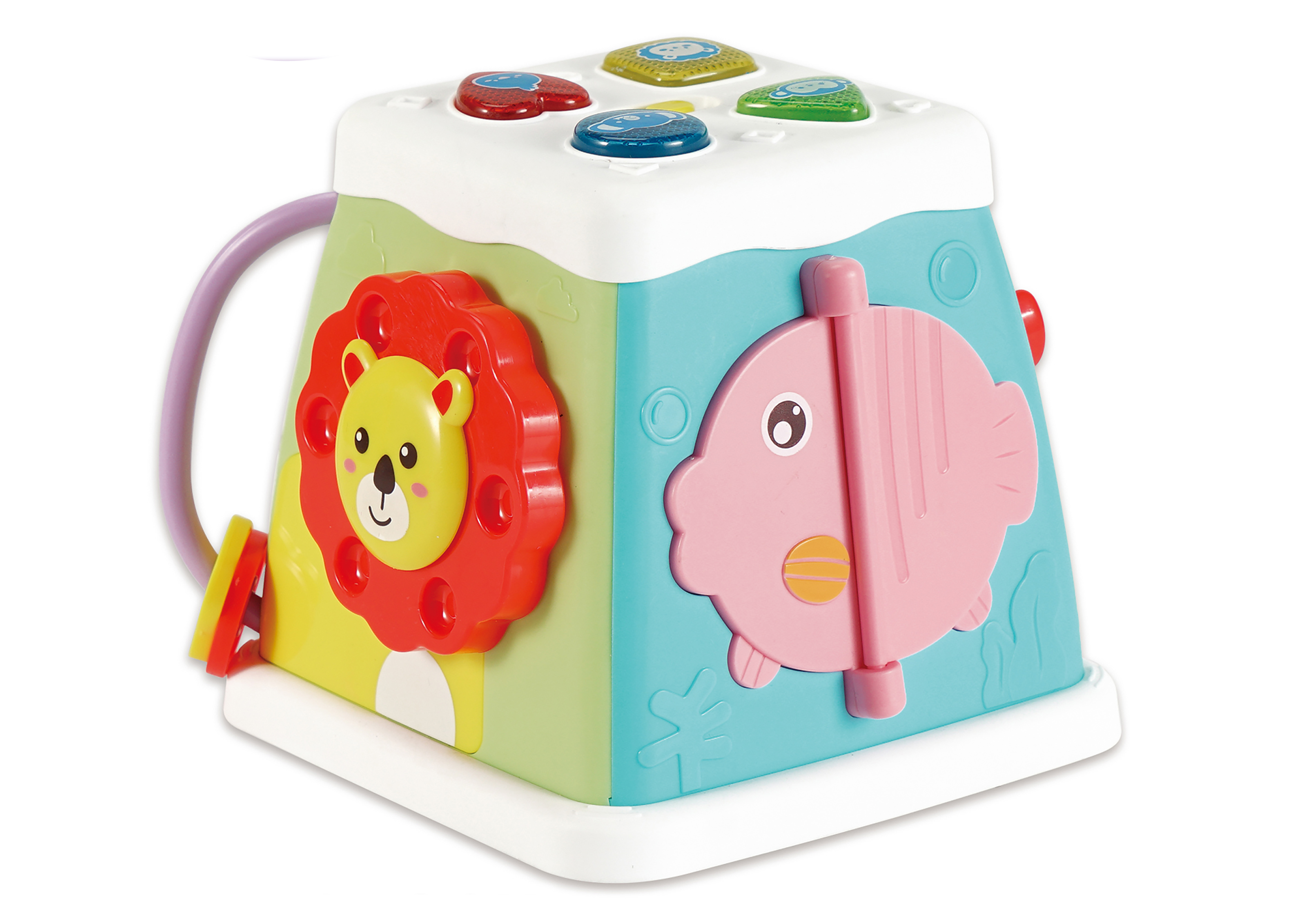 Interaktivní kostka. Velikost 13cm. Baterie 3xAA nejsou součástí. Tlačítko on/off, světelné a zvukové efekty.