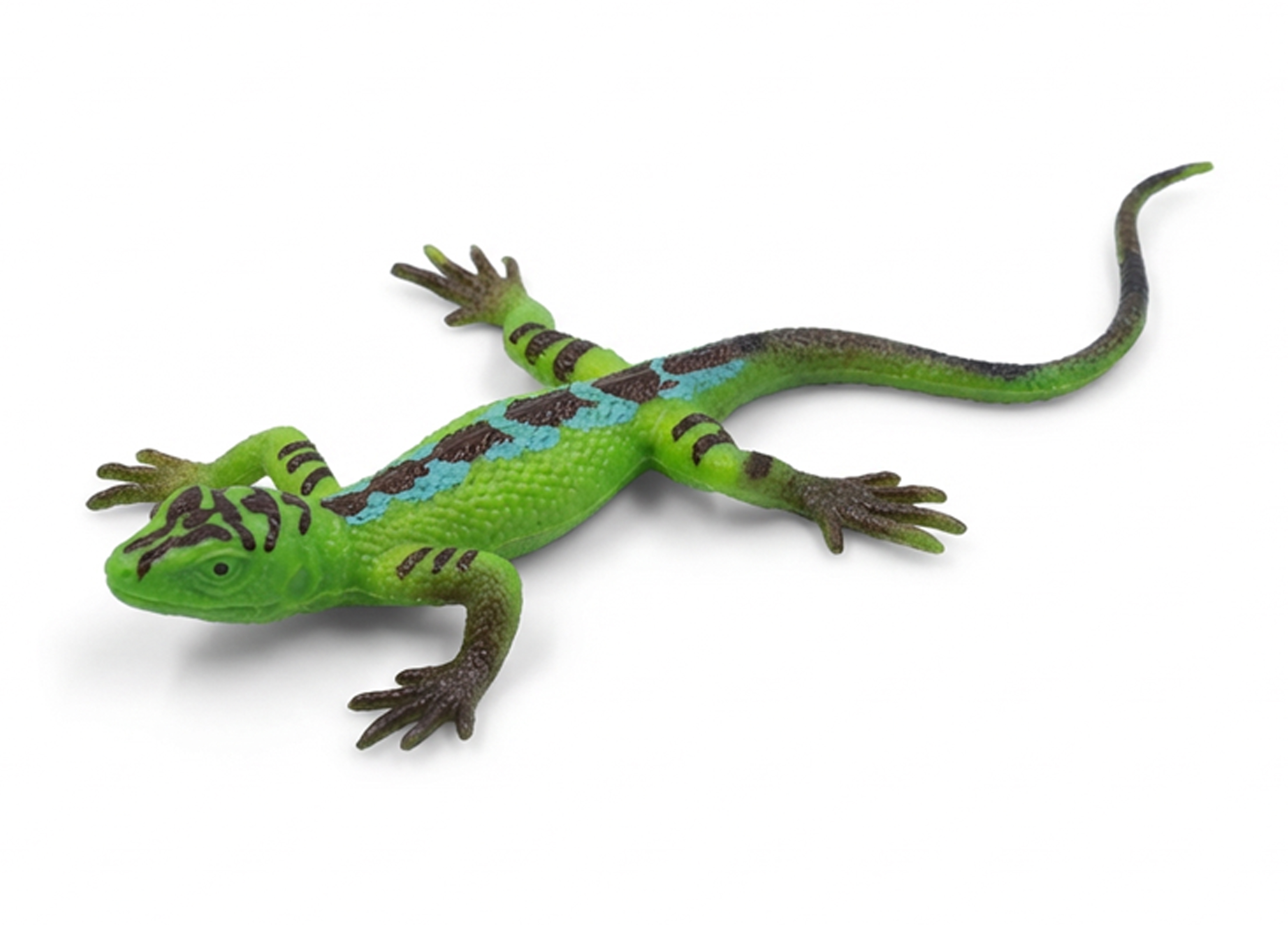 Jašterica gumová zelená. Rozmery 17x8x2 cm.