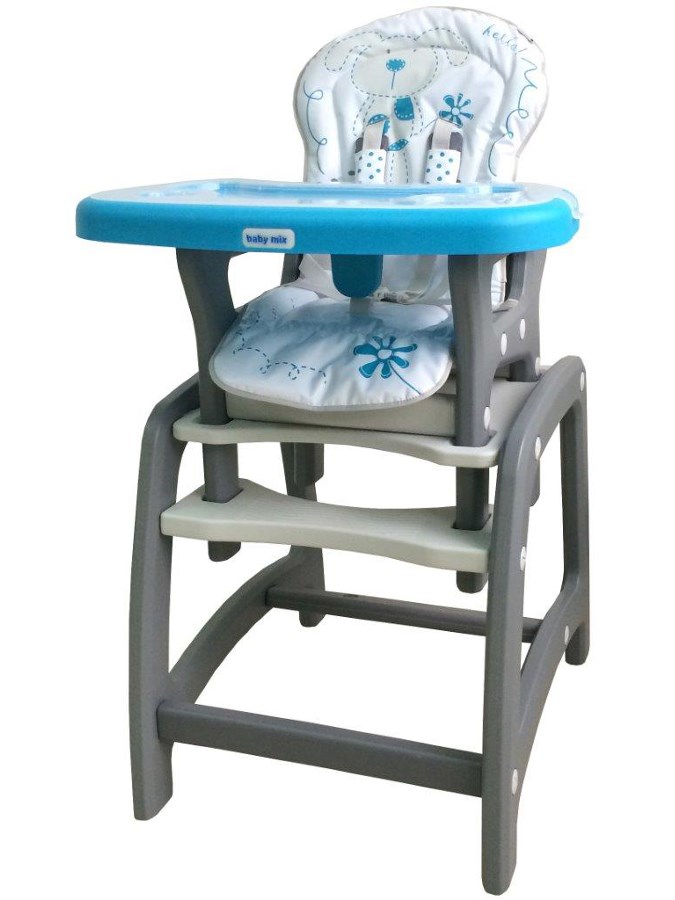 Jedálenská stolička Baby Mix 2v1 v atraktívnych farbách s veselými motívmi. Jedná sa o klasickú jedálenský stoličku s vysoko kvalitným poťahom, ktorý je veľmi mäkký a príjemný na dotyk. Stolička má 5-bodové bezpečnostné pásy, ktoré zaručujú bezpečie dieťaťa. Jedálenský pultík možno polohovať. Po odobratí jedálenského pultíku možno stoličku prisunúť k jedálenskému stolu. Nie je predsa nad spoločné stolovanie. Jedálenskú stoličku možné rozložiť na stôl a stoličku. Ideálne pre kŕmenie a zábavu. Deti budú rady, že majú svoj stolček.