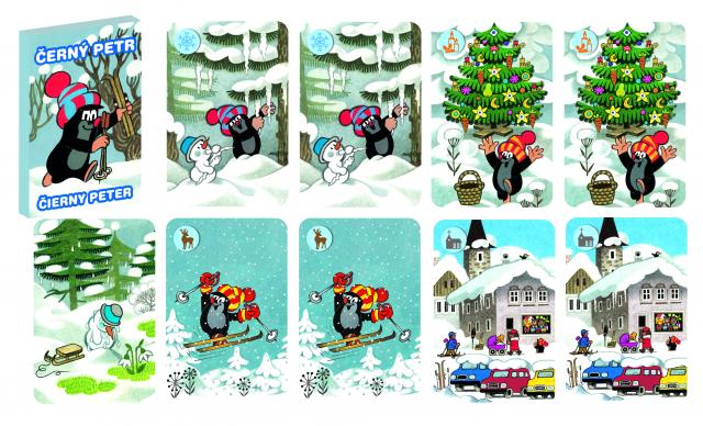 Detské karty pre hru zvanú Čierny Peter s obrázkami Krtka od ilustrátora Zdeňka Milera. Krabička obsahuje i podrobný návod a karty majú na rubovej strane mierne zdrsnený povrch pre lepšiu manipuláciu s nimi.