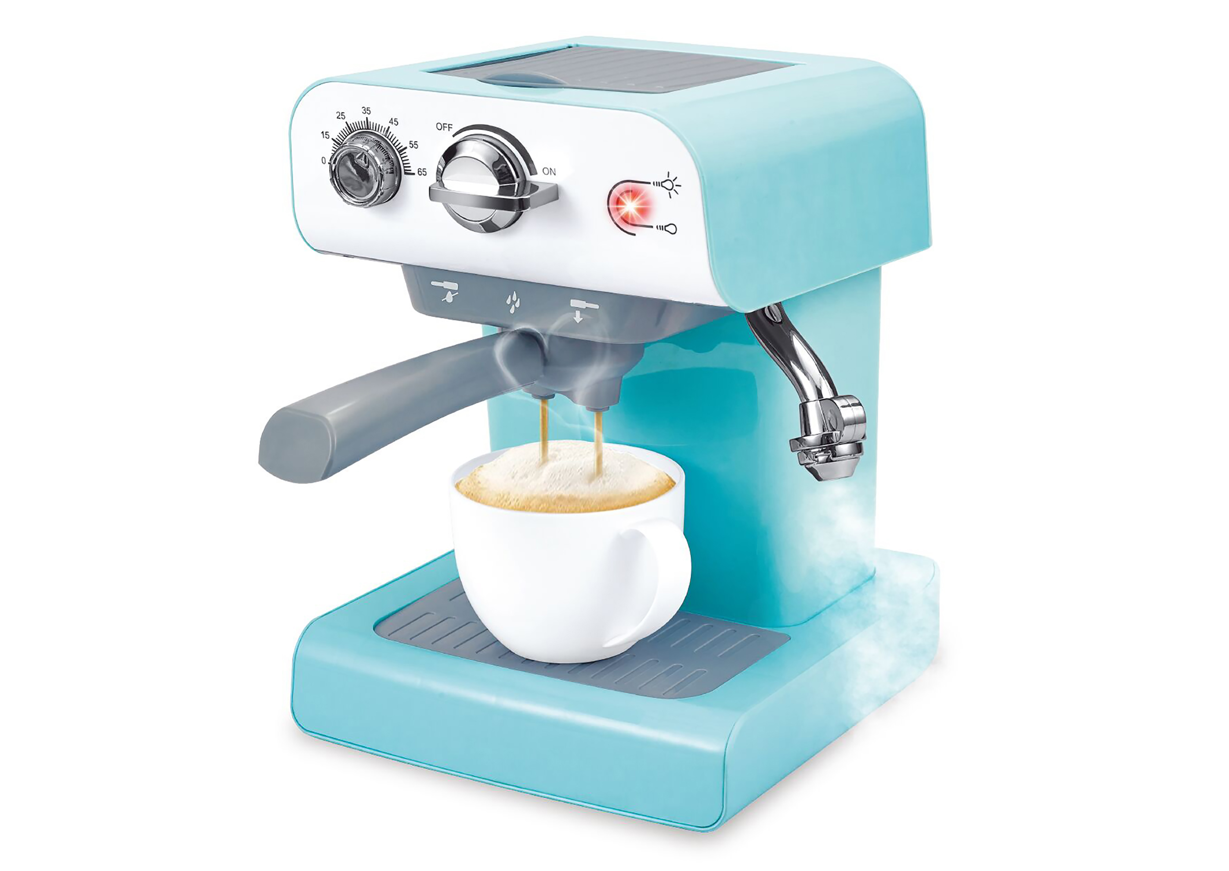 Kávovar pákový s efekty a párou. Rozměry 22x21x26.5cm. 3xAA baterie nejsou součástí. nádržka na vodu je na horní straně kávovaru. Když páka směřuje doprava, dá se odejmout nebo přidělat. Pro zafixování dejte páku směrem dopředu. Světelné a zvukové efekty. Když se kávovar zapne a rozsvítí se kontrolka, vychází z trysky pára.