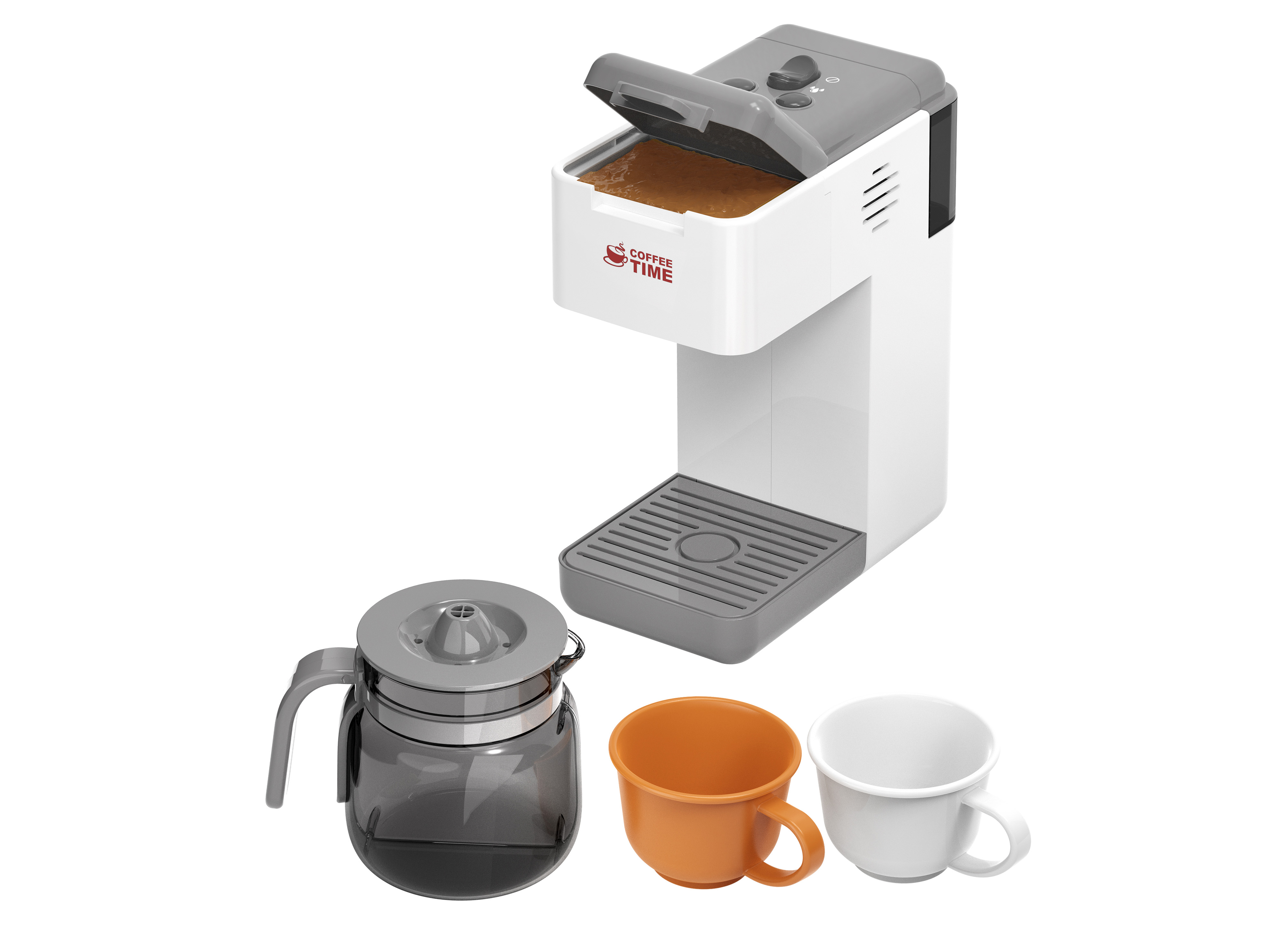 Kávovar s kanvicou a tečúcou vodou. Rozmery 20x9x20cm. 2xAA batérie nie sú súčasťou. svetelné a zvukové efekty. obsahuje kávovar, kanvicu a dva hrnčeky. Po naplnení kávovaru vodou do nádrže na zadnej strane kávovar napúšťa vodu do kanvice. tlačidlo on/off. obrázkový návod na obale.