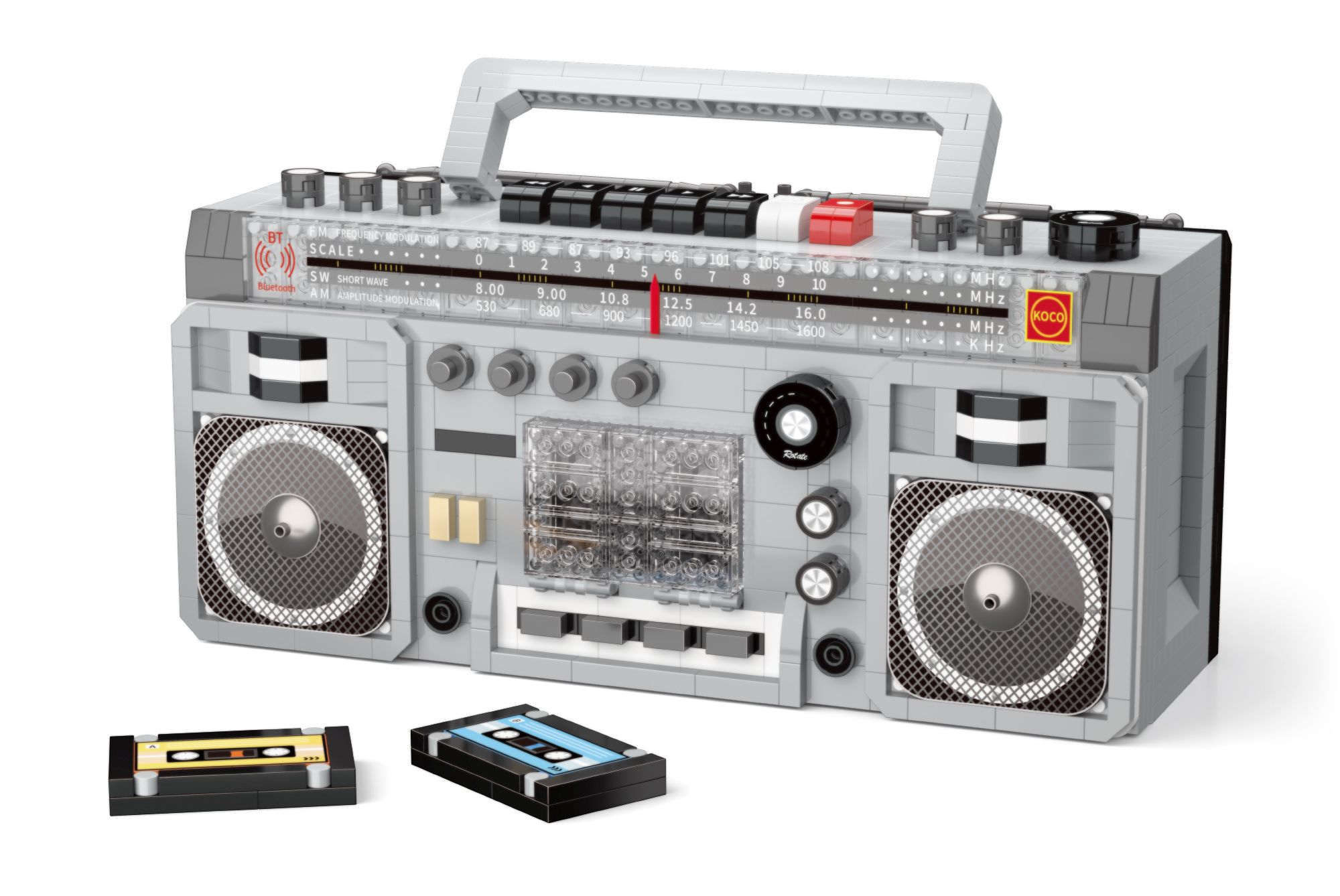 KOCO Stavebnica Kazetový prehrávač 1982 dielikov. Rozmery 18,5x7,5x14,5 cm. Súčasťou sú 2 figúrky. Obrázkový návod na zostavenie súčastí.
