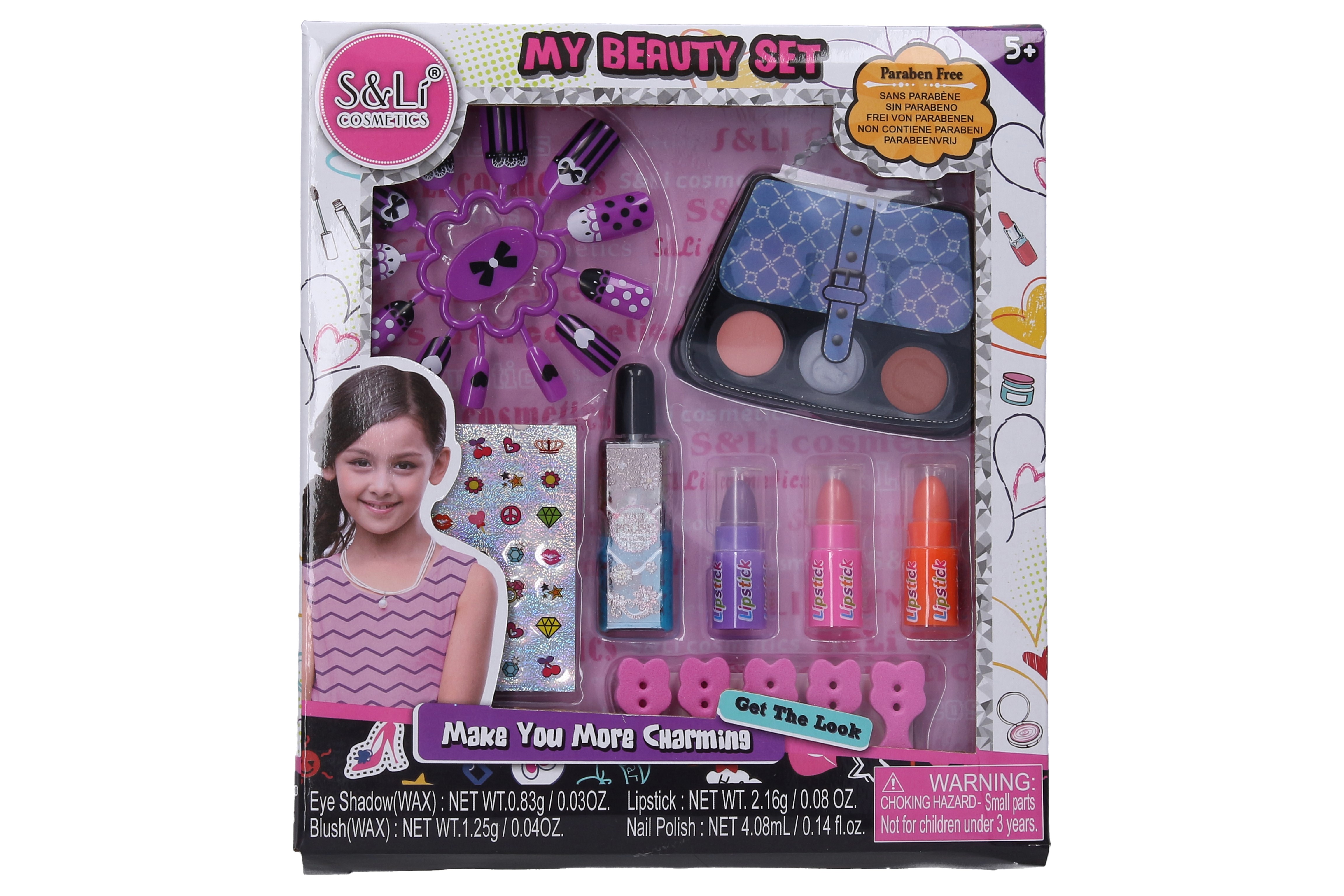 Kozmetické štúdio set. Obsah balenia - lak na nechty, rozdeľovač prstov, umelé nechty, rúž, makeup, dekorácie na nechty. 2 varianty - ružová, fialová. Rozmery 20,8x18,8x2 cm.