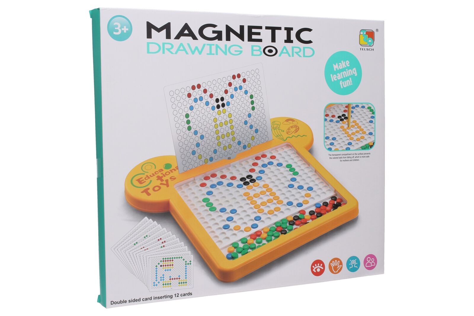 Magnetická tabulka. Jen žlutá barva. Velikost 40cm. Pomocí přiložené magnetické tužky se umísťují magnetky na potřebná místa a tvoří se tak libovolný obrázek. Obsahuje předlohy s různými obrázky. Přitlačením magnetické tužky na tabulku se magnetka přichytí k tužce, dá se tak přemístit a oddálením tužky od tabulky magnetka spadne na příslušné místo.