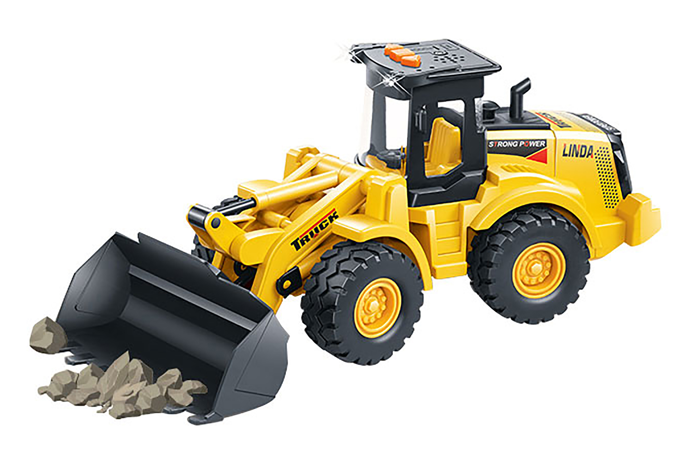 Nakladač na setrvačník s efektmi. Rozmery 35x11x13 cm. S pohyblivou radlicou. Na setrvačník. Vydáva svetelné a zvukové efekty. Aktivácia tlačidlami na streche. 3xAG13 batérie, súčasťou balenia.