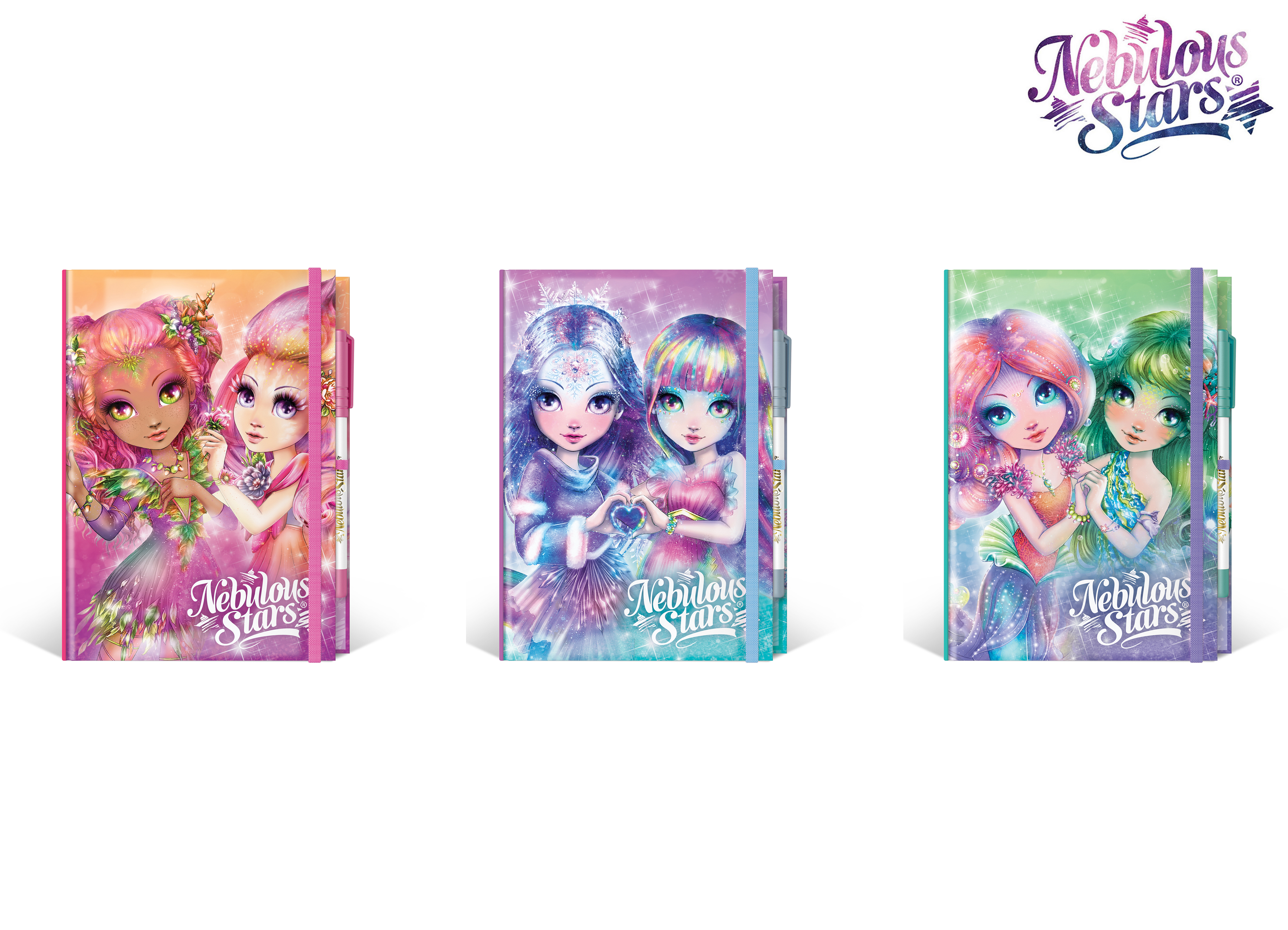 Nebulous Stars denník. Veľkosť 20x15 cm. Denník s bielymi stránkami, 96 strán, pero. Display box - 6 ks. 3 varianty - biela, fialová, ružová.