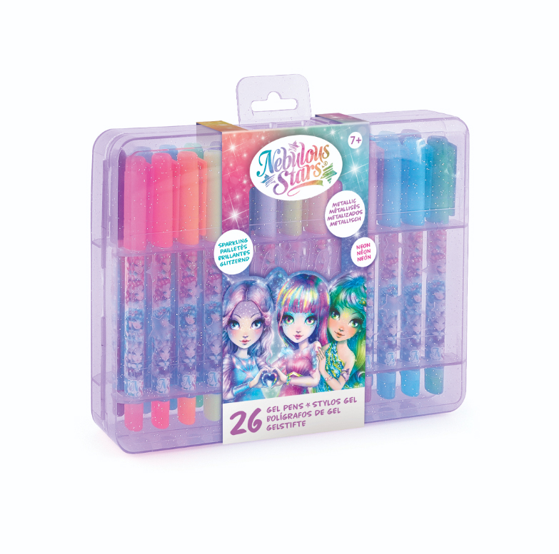 Nebulous Stars Gélové perá set. Plastový kufrík, ktorý obsahuje 26 gélových pier. Třpytivé neonové farby. 9 pier s trblietavým gélom, 8 metalických pier, 8 neonových pier, 1 čierne gélové pero. Display box - 6 ks.