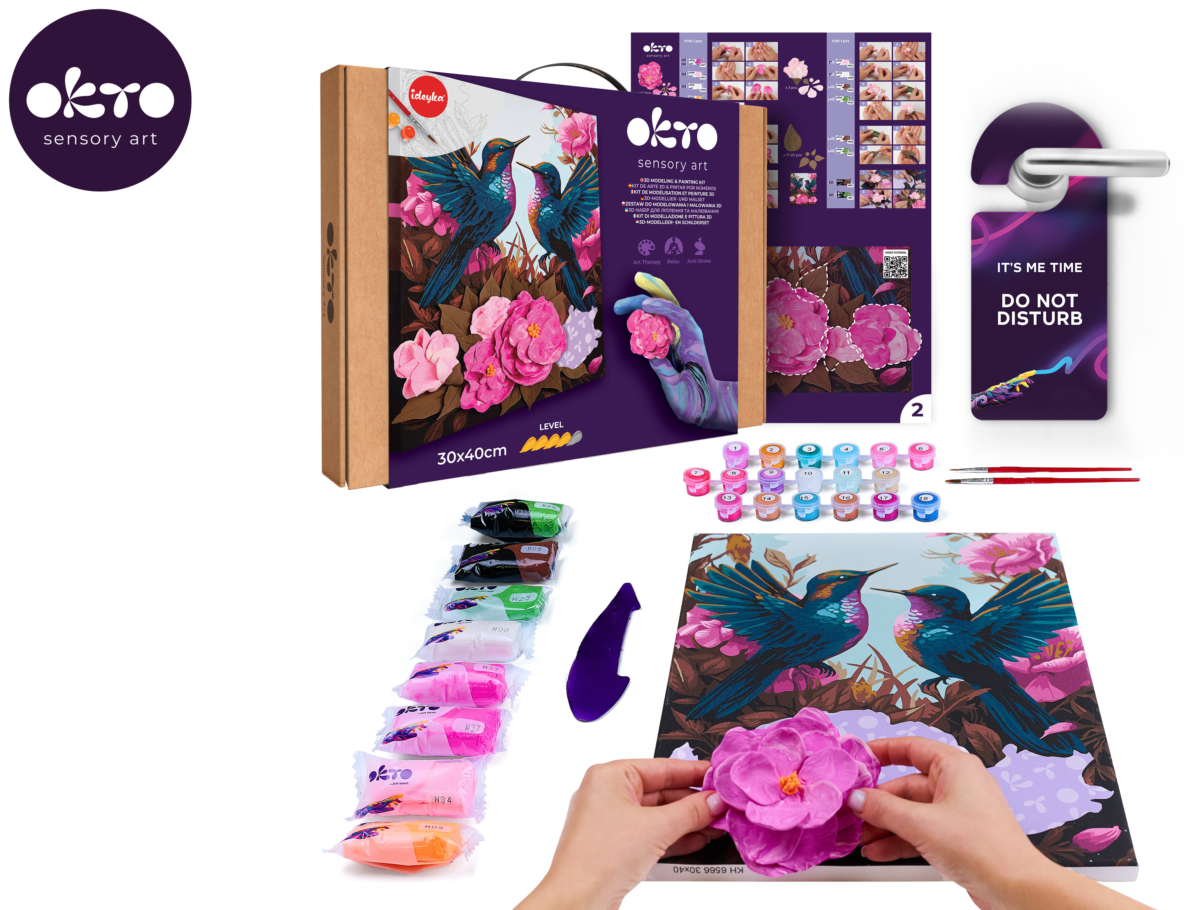 OKTO Maľba a 3D modelovanie obraz "Kolibríky v Láske". Veľkosť plátna 30x40 cm. Vymaľujte obrázok podľa čísel a vytvarujte 3D prvok obrazu. Obtiažnosť 4/5. Obsah balenia - plátno, obrázkový návod, modelovací nástroj, súprava samoschnúcej modelovacej hmoty, set farieb na maľovanie, štetec.