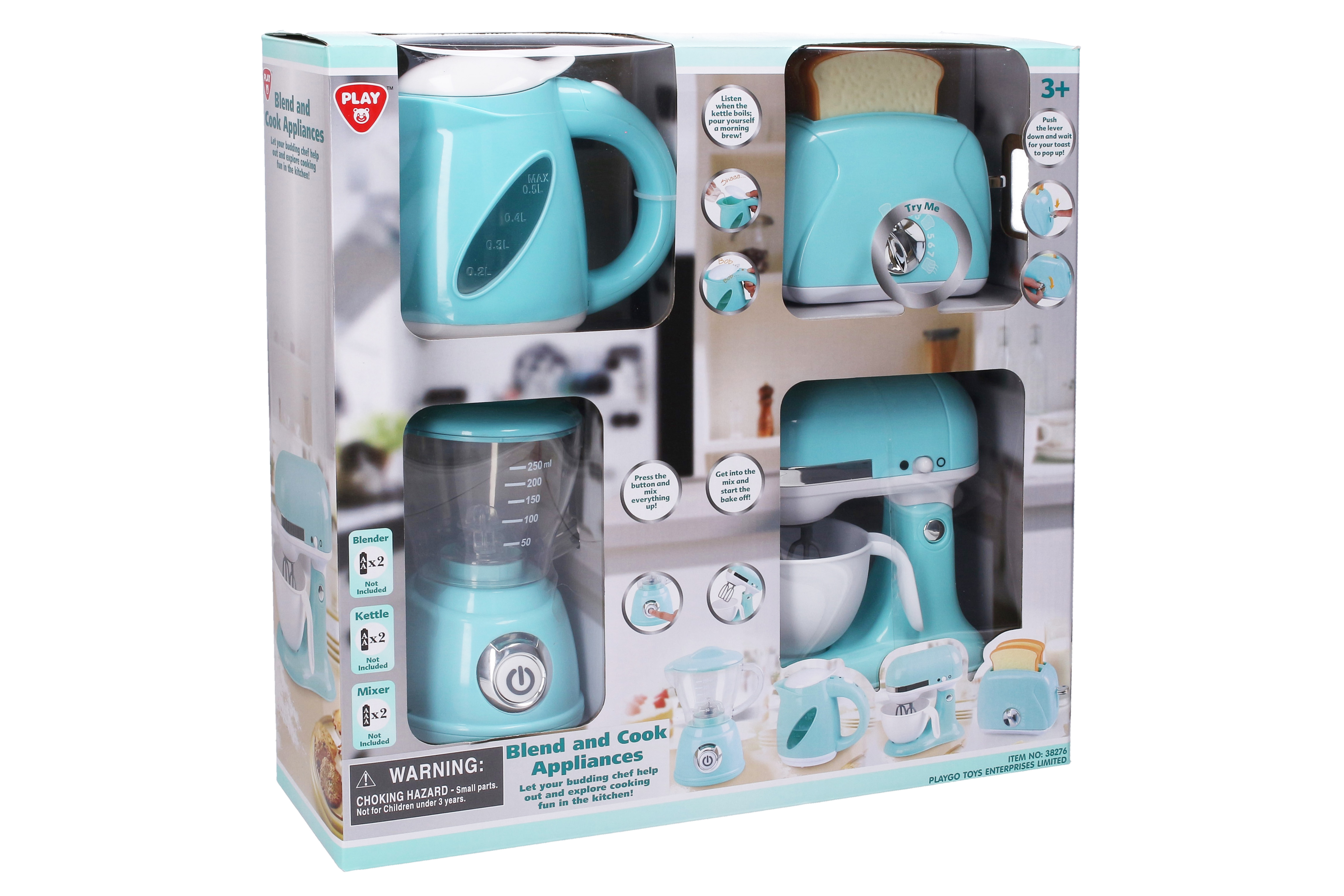 Playgo kuchynské spotrebiče set 4ks. Obsahuje: varnú kanvicu, toaster, mixér a kuchynský robot. Toaster po zatlačení páčky dolu a nastavení kolieska začne tikať a po uplynutí času toasty vyskočia. Mixér pri držaní stlačeného tlačidla mixuje. Kuchynský robot po zapnutí tlačidla mixuje, po vypnutí sa zastaví. Kanvica vydáva zvuk variacej vody. Batérie 2xAAA (kuchynský robot), 2xAA (mixér) a 2xAA (kanvica). Batérie nie sú súčasťou balenia.