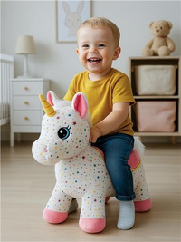 Plyšové nafukovacie hopsadlo je zárukou dlhotrvajúcej zábavy pre Vaše dieťa. Pri hopsaniu dieťa posilňuje nohy, učí sa koordinovať pohyby a držať stabilitu. Hopsadlo sa pohodlne drží za uši a obsahuje zvukový modul, ktorý po stlačení medzi ušami vydáva realistický zvuk koníka. Je potiahnuté plyšovým materiálom, ktorý je príjemný na dotyk a nešmýka. Súčasťou balenia je pumpička k pohodlnému nafúknutiu a batérie (3xLR44).