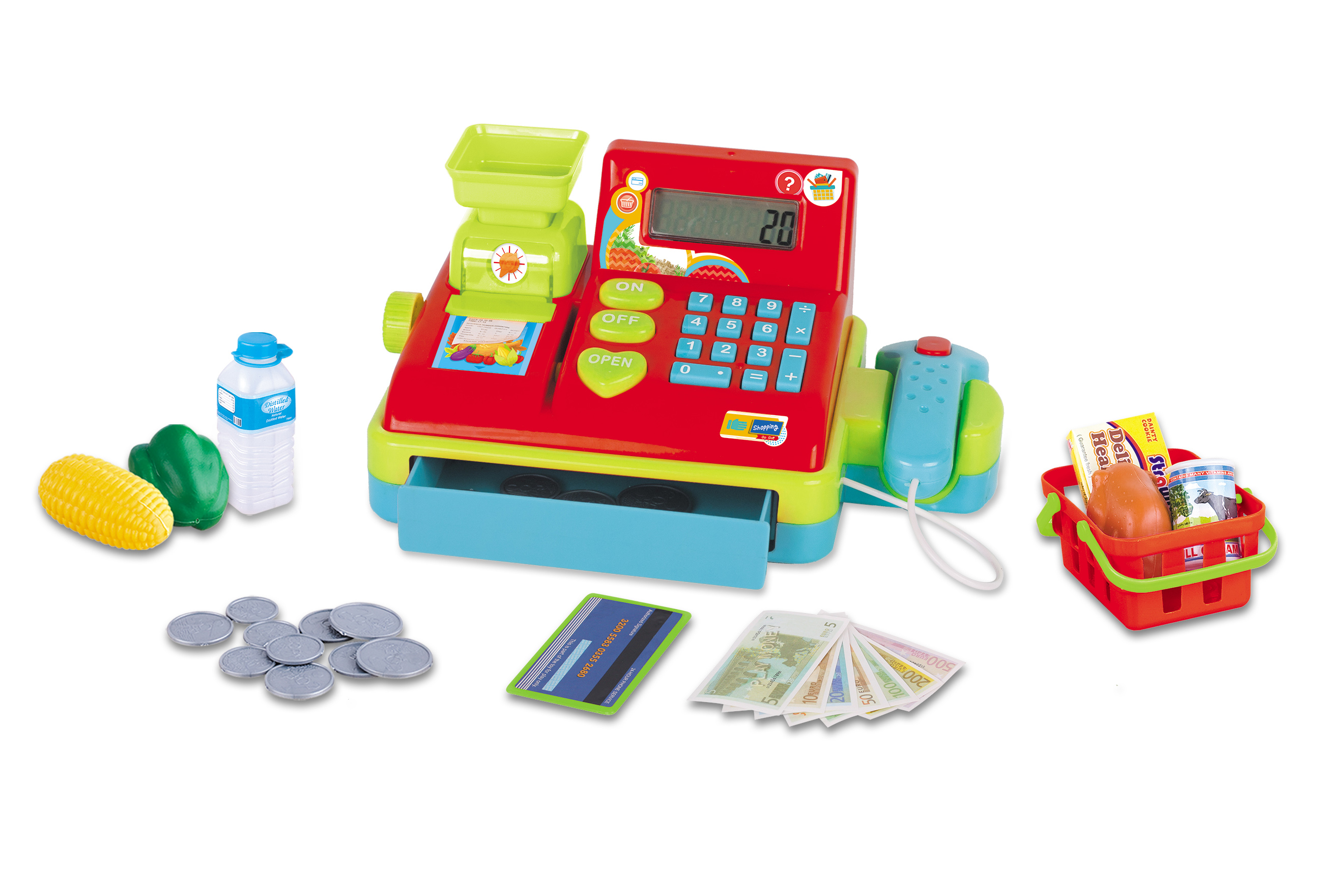 Pokladna s efekty 23cm. Pokladna funguje jako kalkulačka. Obsahuje pokladnu s váhou, vyjížděcí papírovou účtenkou, vysunovacím šuplíkem, peníze a košík s nákupem. Světelné a zvukové efekty. Při použití karty se pokladna vynuluje. Baterie 2xAA součástí.