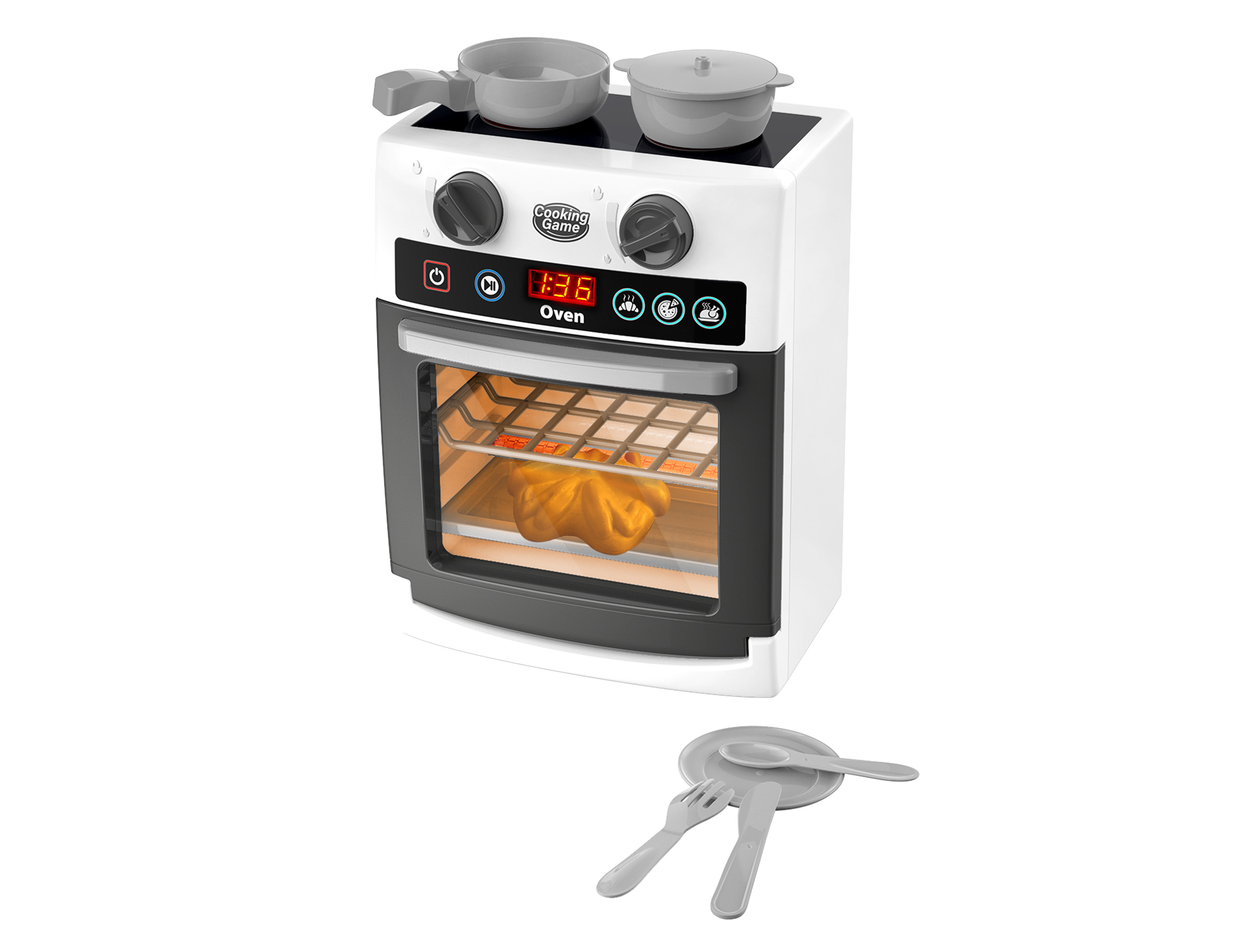 Rúra s efektmi. Rozmery 20x13.8x25.5cm. svetelné a zvukové efekty. Obsahuje riady a kurča. Ovláda sa tlačidlami na rúre, Tlačidlo on/off rúru zapne a výberom programu pečenia sa spustí odpočet. Aby rúra fungovala správne, musia byť dvierka zatvorené. 3xAA batérie nie sú súčasťou.