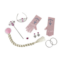 Exkluzívna sada pre všetky malé princezné! Krásna korunka s náušnicami, prstienky, prútikom, náramky a rukavicami. Doplnky sú zdobené ružovými prvky. Súčasťou je dlhý vrkoč v blond prevedení. Perfektná sada ku kostýmu! Doporučené pre dievčatá od 3 rokov.