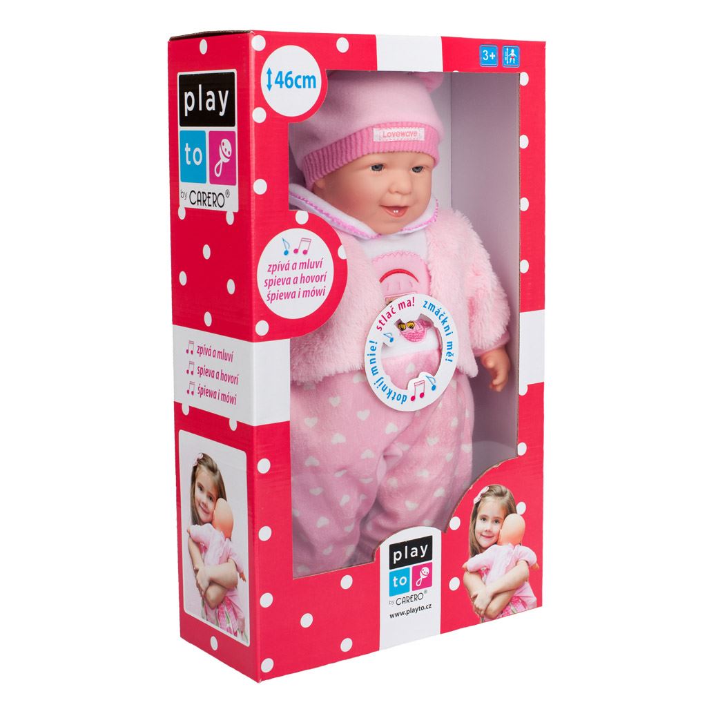 Krásna detská bábika PlayTo. Skvelá hračka pre každé dievčatko, ktoré bude mať svoje hovoriace bábätko. Hlava, ruky a nohy sú vyrobené z gumy, telíčko potom z mäkkého materiálu, vďaka čomu sa môže dieťa k bábike krásne pritúliť. Bábika má milú tváričku, ktorá vyzerá ako naozajstné bábätko a získa si srdce dievčatka svojimi modrými kukadlami a ružovými perami. Má roztomilé oblečenie a čiapočku. Oblečenie je možné vyzliecť a vyprať. Dĺžka bábiky je 46 cm a je zabalená vo farebnej krabici a je vhodná aj ako milý darček. Bábika má slovensky hovoriaci modul, ktorý sa nachádza v kapsičke na brušku. Modul po stlačení prehráva 5 piesní a hovorí 14 slovenských viet.