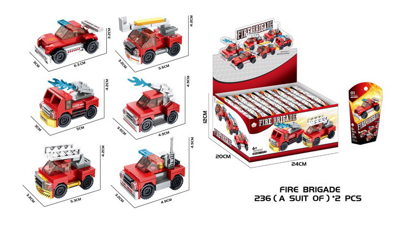 Stavebnica auto hasičské. Rozmery 5,6x3,2x4,2 cm. 12 ks v displejovej krabici. 6 variant.