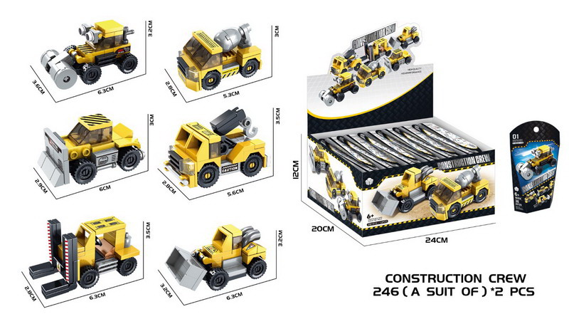 Stavebnice auto stavební. Rozměry 6,3x3,6x3,2 cm. 12 ks display box. 6 variant - válec, domíchávač, buldozer, odtahovka, vysokozdvižný vozík, nakladač.