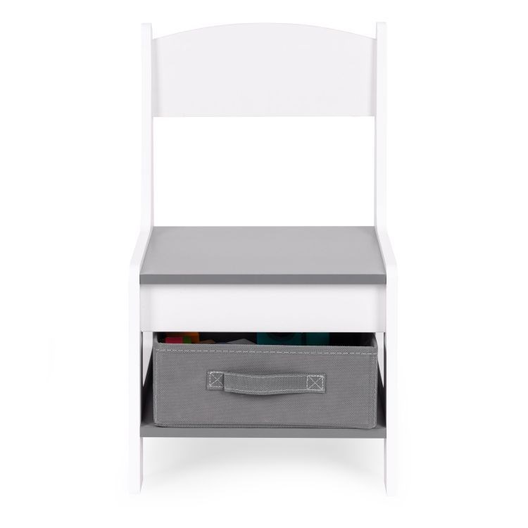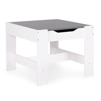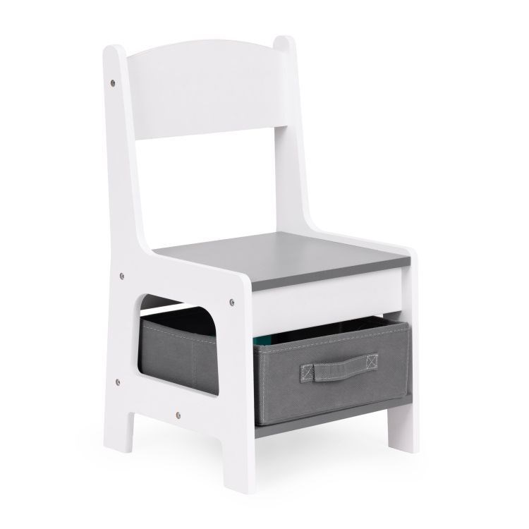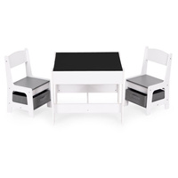 Súprava obsahuje 2 stoličky a stolík. Nábytok má odolnú a stabilnú MDF konštrukciu. Stolík je vybavený obojstrannou, snímateľnou doskou, z ktorej jedna strana slúži ako kriedová tabuľa. Pod doskou sa nachádza praktický úložný priestor na kocky, hračky alebo iné drobnosti. Pod sedadlami stoličiek sú umiestnené priestranné textilné zásuvky vhodné na uloženie hračiek. Súprava je ideálna do detskej izby, herní alebo čakární.