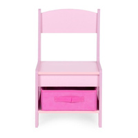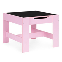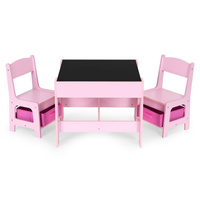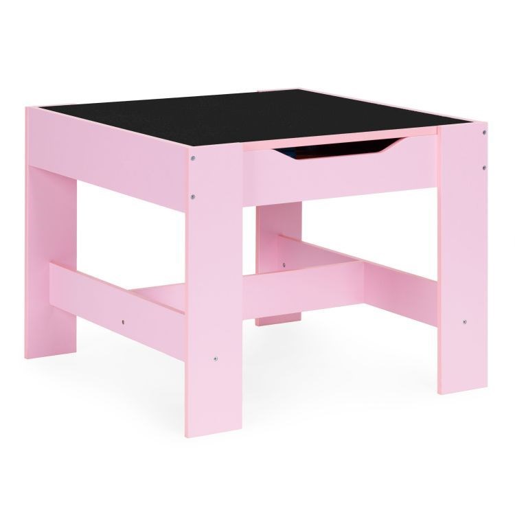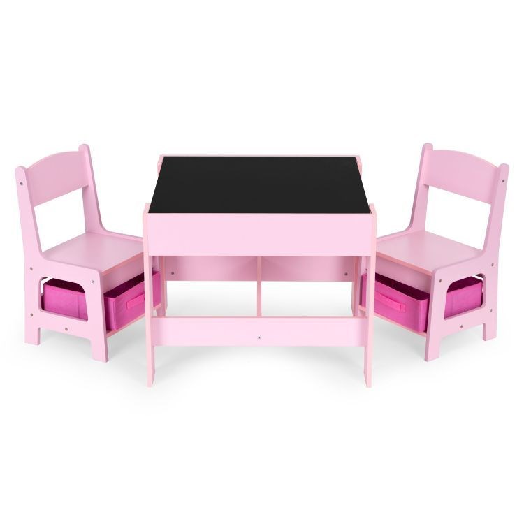 Súprava obsahuje 2 stoličky a stolík. Nábytok má odolnú a stabilnú MDF konštrukciu. Stolík je vybavený obojstrannou, snímateľnou doskou, z ktorej jedna strana slúži ako kriedová tabuľa. Pod doskou sa nachádza praktický úložný priestor na kocky, hračky alebo iné drobnosti. Pod sedadlami stoličiek sú umiestnené priestranné textilné zásuvky vhodné na uloženie hračiek. Súprava je ideálna do detskej izby, herní alebo čakární.