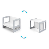 Sada sa skladá z jedného stolíka a jednej stoličky, ktoré vďaka modulárnej konštrukcii môžu plniť rôzne funkcie – stolík je možné premeniť na väčšie sedadlo a stolička sa výborne hodí ako menší stolík alebo sedadlo bez operadla pre staršie dieťa. Vďaka svojej ľahkej konštrukcii je tento nábytok ľahko prenosný, čo umožňuje deťom prispôsobiť si ho podľa svojich potrieb.